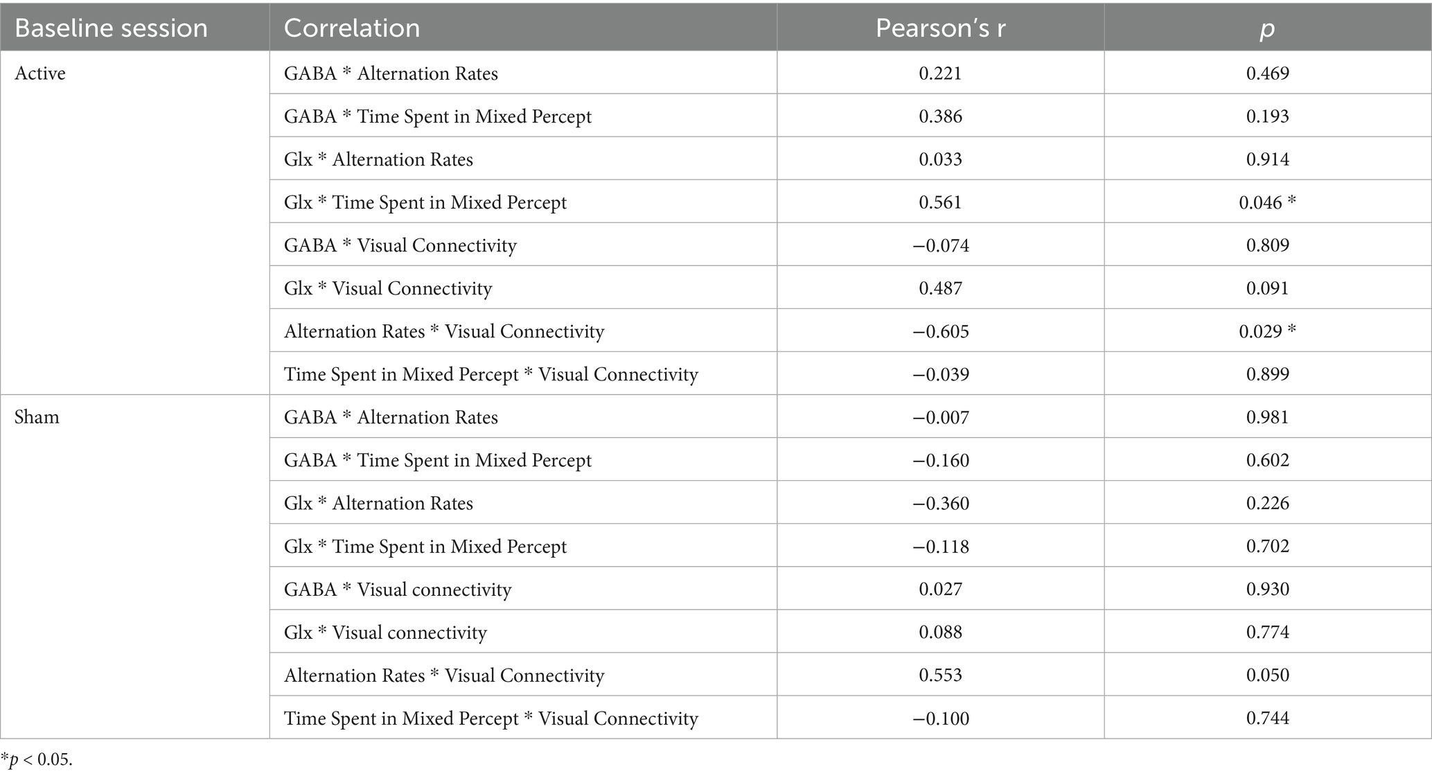 Table 1. Associations among GABA or Glx concentrations, binocular rivalry metrics, and visual cortex functional connectivity for active and sham conditions before stimulation at baseline.