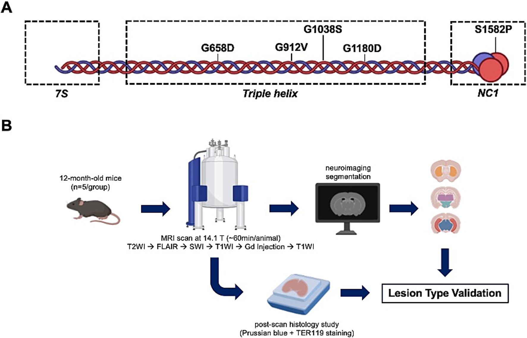 Figure 1. Overall study design. (A) Schematic of the structure of the collagen IV molecule (triple helix) and five Col4a1 missense mutations studied. Type IV collagens contain three major structural domains: the 7S, the triple helix (collagenous) and the globular non-collagenous 1 (NC1). (B) Schematic of the multimodal MRI study workflow. FLAIR, Fluid-Attenuated Inversion Recovery Imaging; Gd, Gadolinium; SWI, Susceptibility-Weighted Imaging; T2WI, T2-Weighted Imaging; T1WI, T1-Weighted Imaging. Created with BioRender.com.