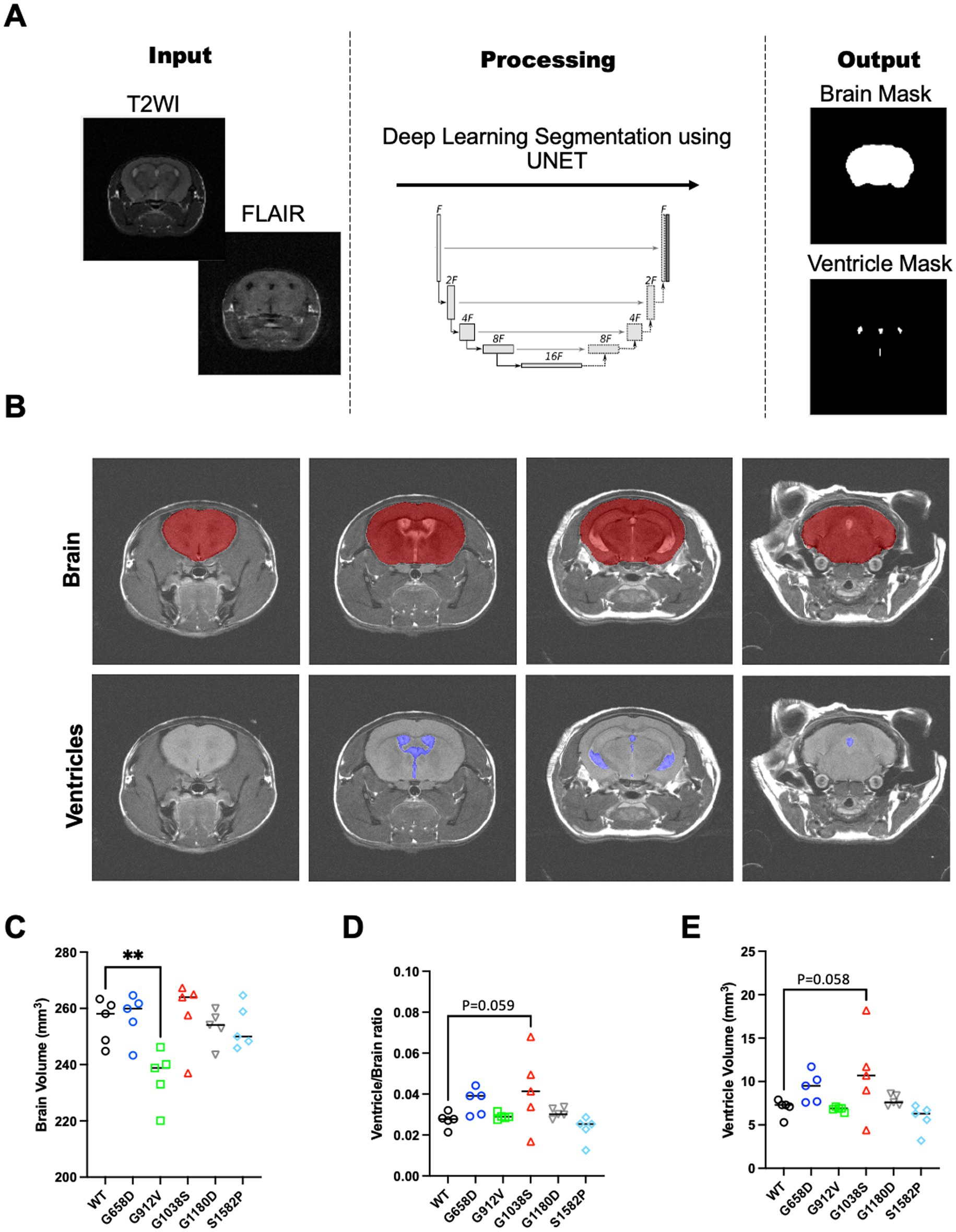 Figure 2. Volumetric analysis using U-net. (A) Schematic of the convolutional neural networks (U-net) implemented: (1) skull-stripping U-net for extraction of whole brain volume; (2) tissue/lesion-specific U-net. (B) Representative segmentation of skull-stripping and ventricle-segmenting U-net. Quantification of (C) Brain volume, (D) ventricle volume, and (E) ventricle-to-brain ratios in mouse models of Gould syndrome. Brain volume was significantly lower in Col4a1+/G912V mice (G912V) compared to Col4a1+/+ (WT) controls (**p < 0.01). Col4a1+/G1038S (G1038S) showed a tendency for increased ventricle volume and ventricle-to-brain ratio compared to WT controls (p = 0.059 and 0.058, respectively).