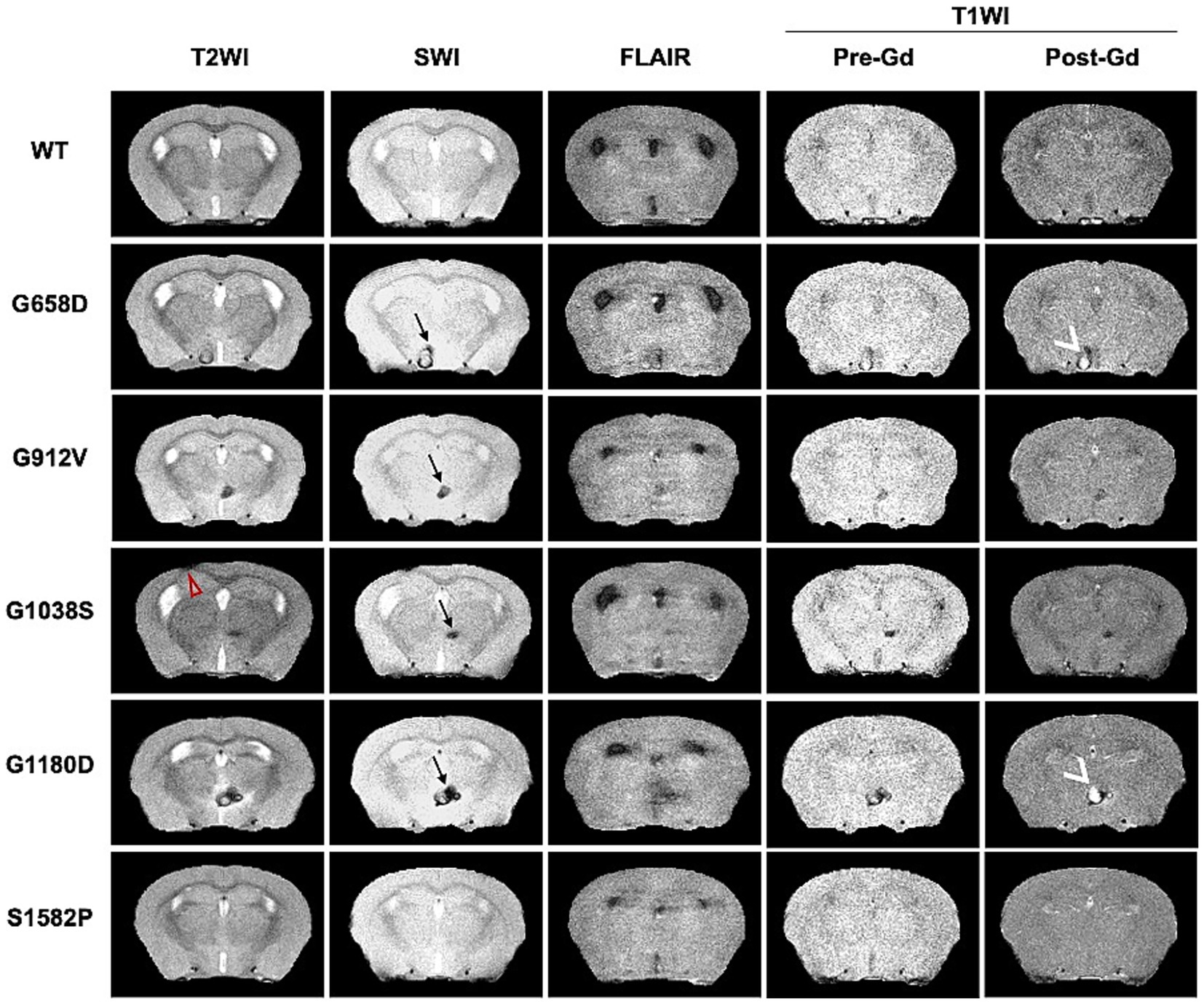 MRI scans showing brain slices under different imaging modalities: T2WI, SWI, FLAIR, T1WI pre-Gd, and post-Gd. Each row corresponds to a genetic variant: WT, G658D, G912V, G1038S, G1180D, and S1582P. Arrows highlight specific areas of interest in some images.