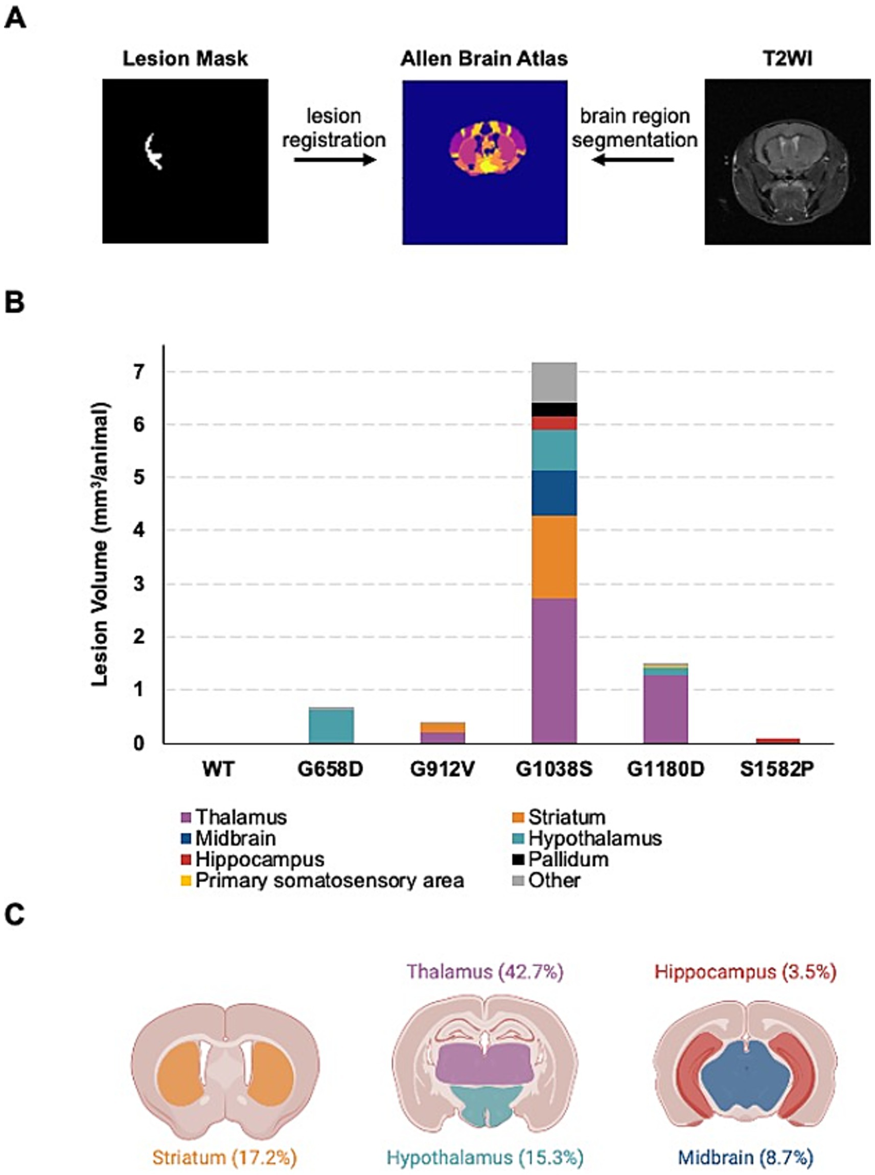 Panel A shows a process from lesion mask to brain region segmentation using the Allen Brain Atlas, presented alongside a T2-weighted MRI image. Panel B is a bar graph depicting lesion volumes in different brain regions across six genotypes: WT, G658D, G912V, G1038S, G1180D, and S1582P. Thalamus and striatum show significant volumes, especially in genotype G1038S. Panel C illustrates brain sections highlighting different regions with percentages: striatum at 17.2%, thalamus at 42.7%, hypothalamus at 15.3%, midbrain at 8.7%, and hippocampus at 3.5%.