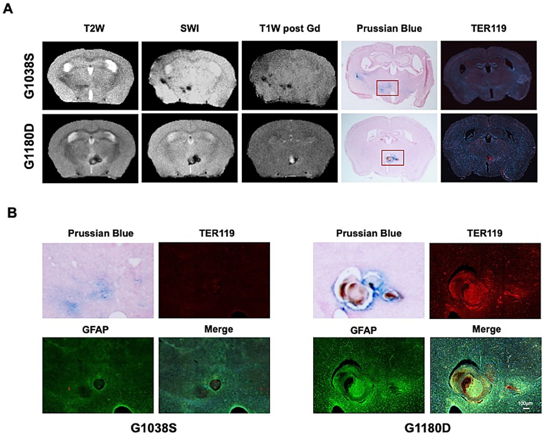 Figure 5. Characterization of Gd(−) vs. Gd(+) SWI-positive lesions in Col4a1 mutant mice. (A) MRI, Prussian Blue staining, and TER119 immunolabeling images of Gd(−) vs. Gd(+) SWI-positive lesions, represented by a Col4a1+/G1038S (G1038S) case (top row) and a Col4a1+/G1180D (G1180D) case (bottom row). (B) Zoom-in outlook of lesions, showing Prussian blue staining, and co-immunolabeling for TER119 and GFAP.
