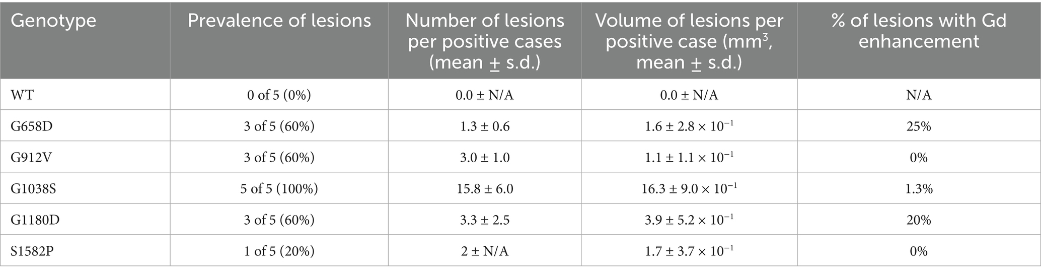 Additionally, we investigated the percentage of SWI-positive lesions that presented Gd enhancement, i.e., Gd(+), as detected by T1WI. Interestingly, these percentages were once again highly variable between genotypes, ranging from no enhancing lesions in Col4a1+/S1582P and Col4a1+/G912V mice, to 20 and 25% in Col4a1+/G1180D and Col4a1+/G658D mice, respectively. Notably, in Col4a1+/G1038S mice, the genotype presenting the highest lesion burden and largest solitary lesion size, only 1.3% of lesions were Gd(+).