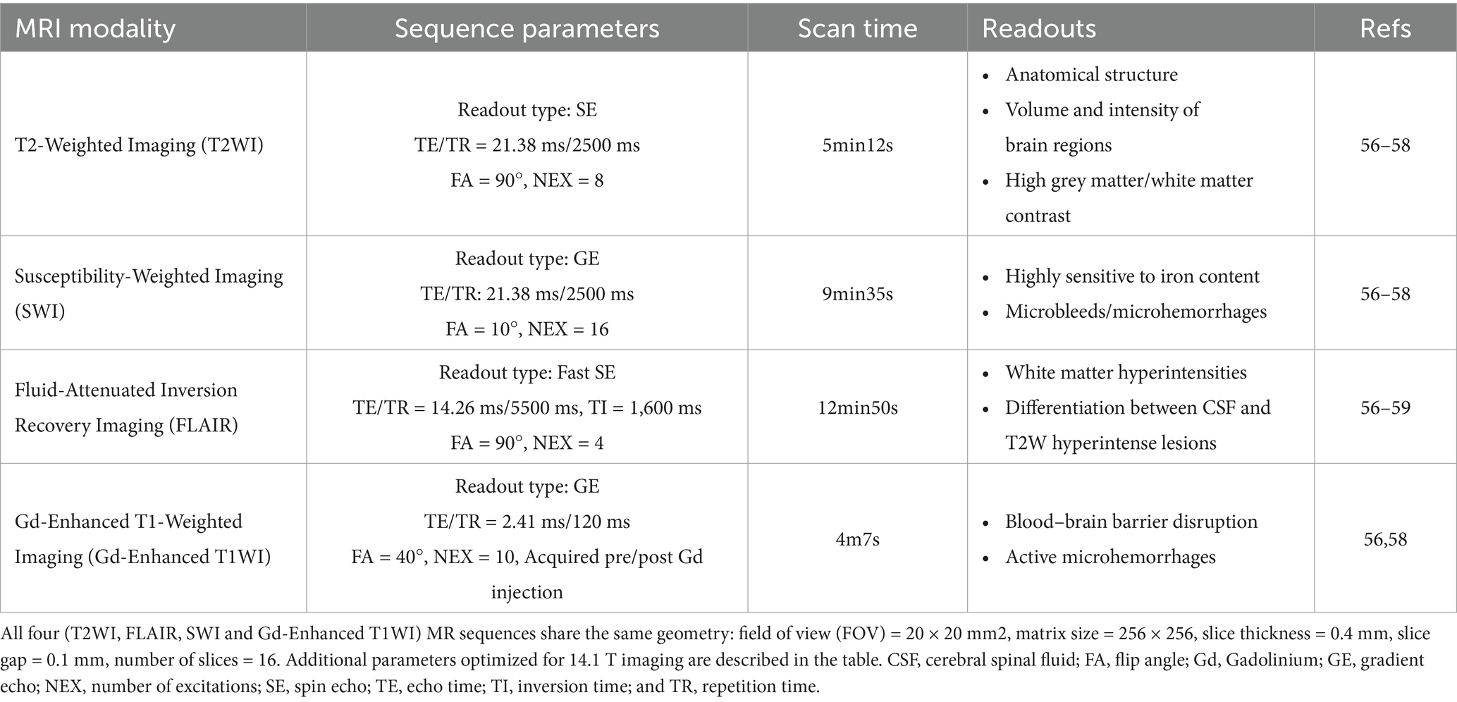 The workflow of this multimodal MRI study is illustrated in Figure 1B. All in vivo MR experiments were conducted on a 14.1 Tesla vertical MR system (Agilent Technologies, Palo Alto, CA) equipped with 100G/cm gradients and a single tuned millipede 1H proton coil (inner diameter = 40 mm). For each imaging session, mice were anesthetized using isoflurane (1–1.5% in O2) and positioned in a dedicated cradle maintaining constant anesthesia and placed in the MR bore; respiration and temperature were continuously monitored during all acquisitions to ensure animal well-being and data reproducibility. Four optimized sequences of matching geometry (axial orientation, field of view (FOV) = 20 × 20 mm2, matrix = 256 × 256, 16 slices, 0.4 mm slice thickness, 0.1 mm interslice gap) were used during the same session for an overall scan time of ~60 min/animal. The sequences are briefly described below, while detailed parameters can be found in Table 2 (Wardlaw et al., 2013; Miura et al., 2017; Thaler et al., 2019; Wu et al., 2023).