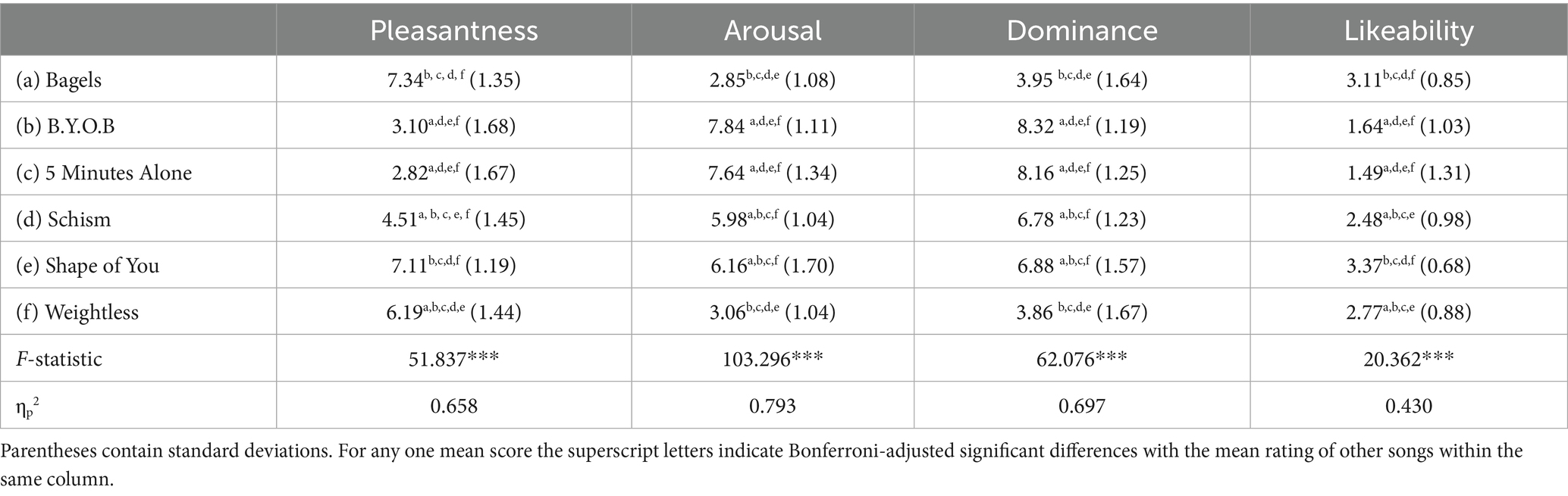 Descriptive statistics for mean responses to the three affective dimensions are displayed in Table 1, with the final column presenting overall likeability scores for each song. The theoretical minimum and maximum scores for the three affective dimensions are 1 and 10 respectively, while for the likeability ratings these are 0 and 4, respectively. Bagels, and its benchmark Weightless, were judged more pleasant and less arousing and dominating than the two harder metal songs (i.e., 5 Minutes Alone, B.Y.O.B). The superscript letters in Table 1 indicate the significant values obtained from post hoc testing of means across songs. Of note, Bagels had significantly higher mean pleasantness ratings than the other songs except for Shape of You, and was significantly less arousing than all songs except for Weightless.