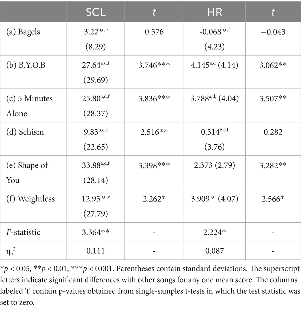 Mean percentage change estimates (re: Equation 1) for the electrophysiological measures are displayed in Table 3, with one-samples t-statistics indicating if the mean was significantly different from 0 (i.e., no change between reference period and song). Repeated-measures ANOVA indicated that significant differences in SCL and HR existed across the six songs. For SCL the most liked song, Shape of You, was linked to greater sympathetic arousal than the two ambient songs (Bagels and Weightless) and to Schism. The two songs with the highest arousal ratings, 5 Minutes Alone and B.Y.O.B., had significantly higher percentage change means than Bagels, Schism, and Weightless. Turning to mean HR change, it was interesting to note significant differences between the two ambient songs (Bagels and Weightless), and that Weightless was statistical insignificant from the two most arousing songs, 5 Minutes Alone and B.Y.O.B.