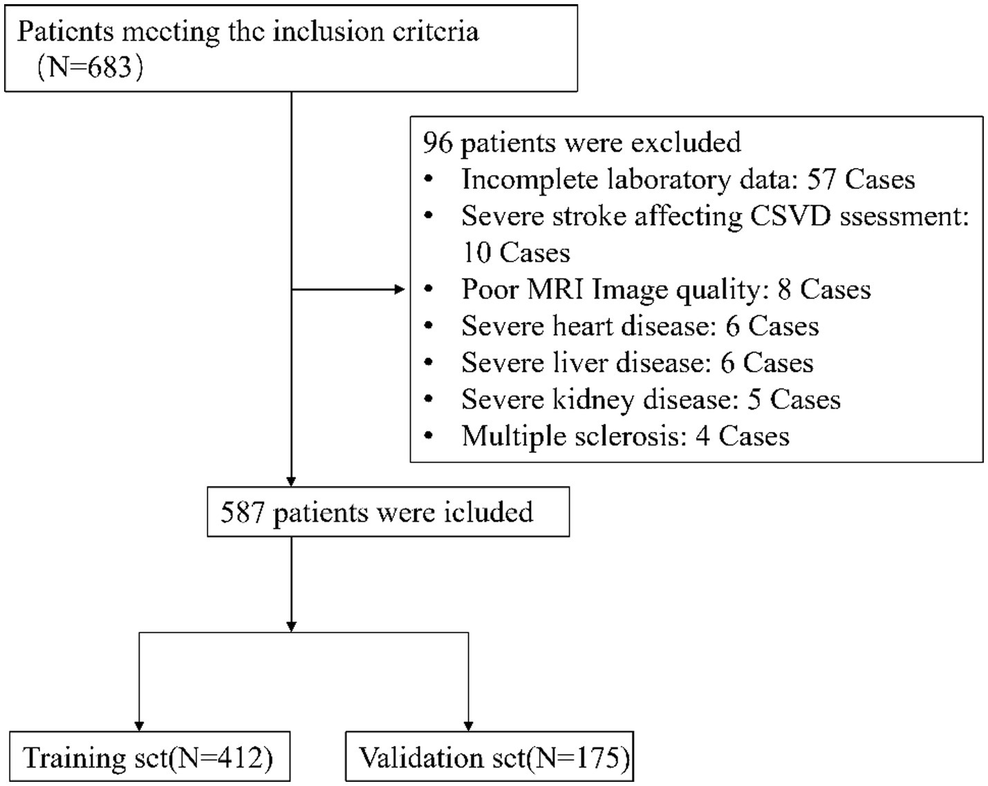 This retrospective study, conducted at a tertiary hospital in Baoding, China, aimed to identify imaging biomarkers for CSVD. The study spanned from January 2020 to June 2022. During this period, we systematically collected and analyzed existing patient records to ensure a comprehensive examination of pre-determined data. The inclusion criteria comprised patients aged 55 years or older who had undergone complete cranial MRI examinations. Patients underwent cranial MRI for routine clinical evaluations due to various neurological symptoms such as dizziness, headache, cognitive impairment, or clinical suspicion of cerebrovascular disease. The exclusion criteria were designed to omit cases that might confound the study’s outcomes, such as patients with poor-quality MRI images, a significant history of stroke defined as large territorial infarctions or hemorrhagic strokes with substantial neurological sequelae, or severe comorbid conditions. Patients with minor ischemic strokes, lacunar infarctions, or transient ischemic attacks (TIAs) who had achieved stable neurological recovery were not excluded, as the study aimed to reflect real-world inpatient populations. Among the 144 patients with a prior stroke history, 82 had lacunar infarctions, 34 had TIAs, 18 had large-vessel ischemic strokes, and 10 had remote hemorrhagic strokes. These conditions included, but were not limited to, advanced cardiac, respiratory, renal, or hepatic diseases, and tumors. Cases indicative of non-vascular origins of CSVD, like multiple sclerosis or central nervous system demyelinating diseases, were also excluded, as were those with insufficient clinical or laboratory data. To ensure the confidentiality and privacy of patient data, all records were anonymized prior to analysis, with all personal identifiers removed. The data handling process adhered strictly to data protection regulations. In line with ethical standards, the requirement for individual informed consent was waived by the Institutional Review Board due to the retrospective nature of the study. This waiver was granted as the study involved minimal risk to participants and used only anonymized data from existing records. The study protocol was thoroughly reviewed and approved by the Institutional Review Board (IRB) of Affiliated Hospital of Hebei University (Approval Number HDFYLL-KY-2023-060). The study adhered strictly to the ethical standards outlined in the Declaration of Helsinki.