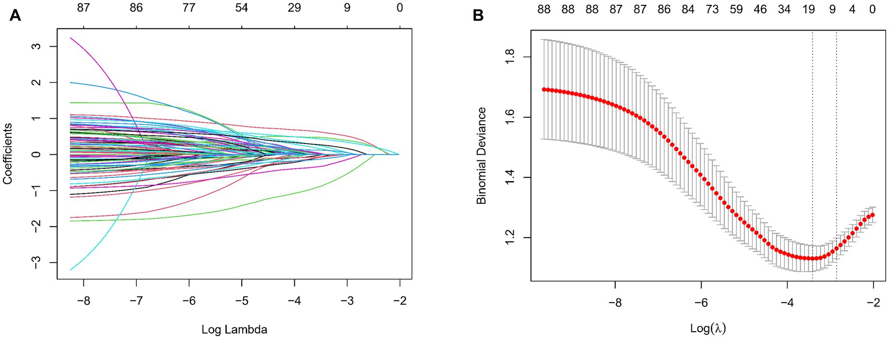 Figure 2. Screening of variables based on LASSO regression model in the training group (412 patients). (A) LASSO coefficient profiles for WMH clinical predictors. This figure presents the coefficient profiles of 88 features considered in the LASSO model for predicting the risk of WMH. The graph displays how each feature’s coefficient varies with the log of lambda (log(lambda)), demonstrating the shrinkage effect of the LASSO technique. (B) LASSO regression cross-validation results. This figure illustrates the evaluation of model performance under various regularization parameters λ through cross-validation in LASSO regression. A vertical dashed line on the left side represents λmin, which corresponds to the model with the best performance. On the right side, another vertical dashed line denotes λ1SE, representing a slightly sparser model. The numbers of selected variables are annotated above each line.
