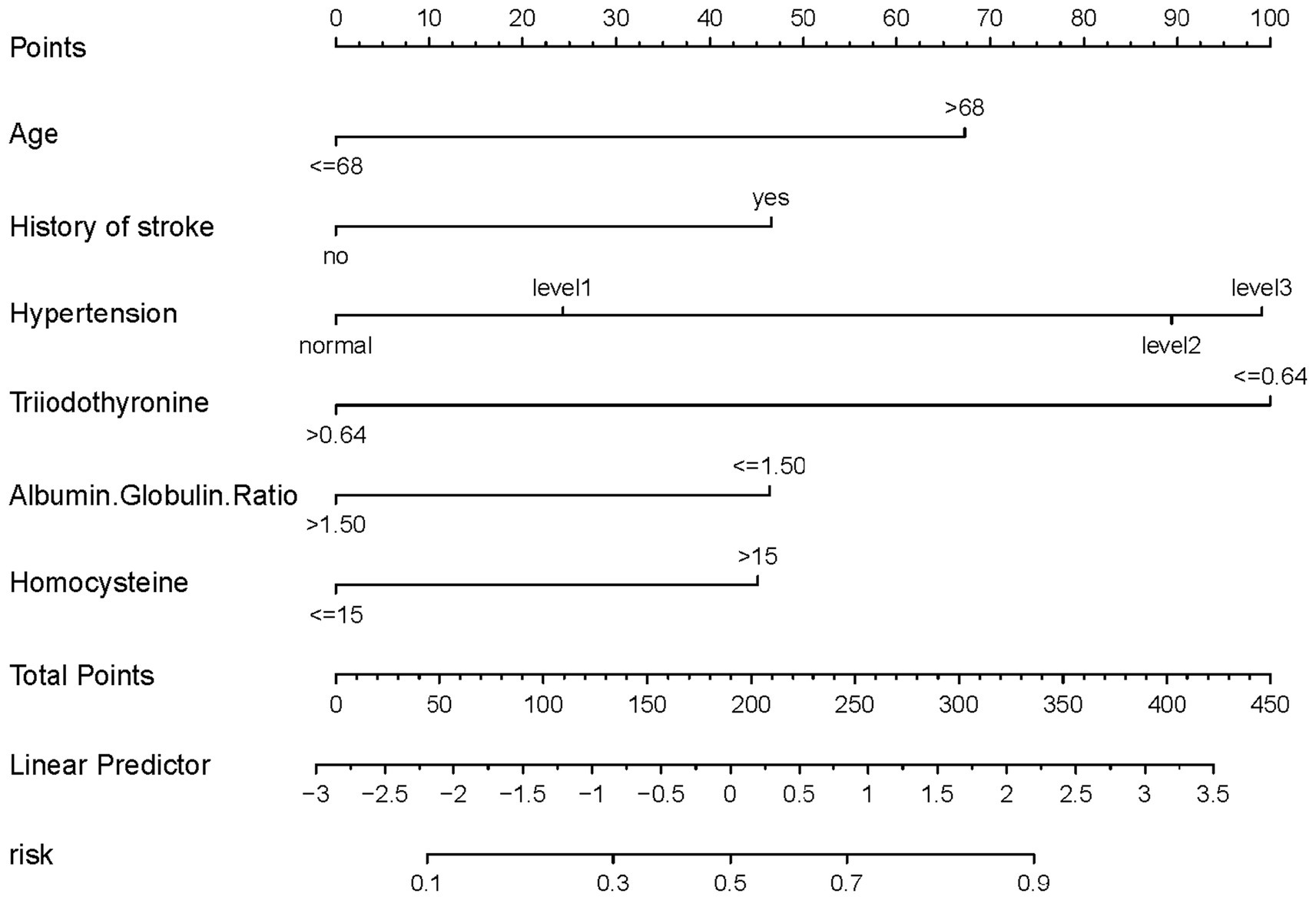 Results: Key predictors included age, history of stroke, hypertension, triiodothyronine levels, albumin- globulin ratio, and homocysteine. The nomogram achieved an AUC of 0.783 (95% CI: 0.738–0.829) in the training cohort and 0.762 (95% CI: 0.690–0.834) in the validation cohort. Calibration and DCA confirmed the model’s clinical applicability.