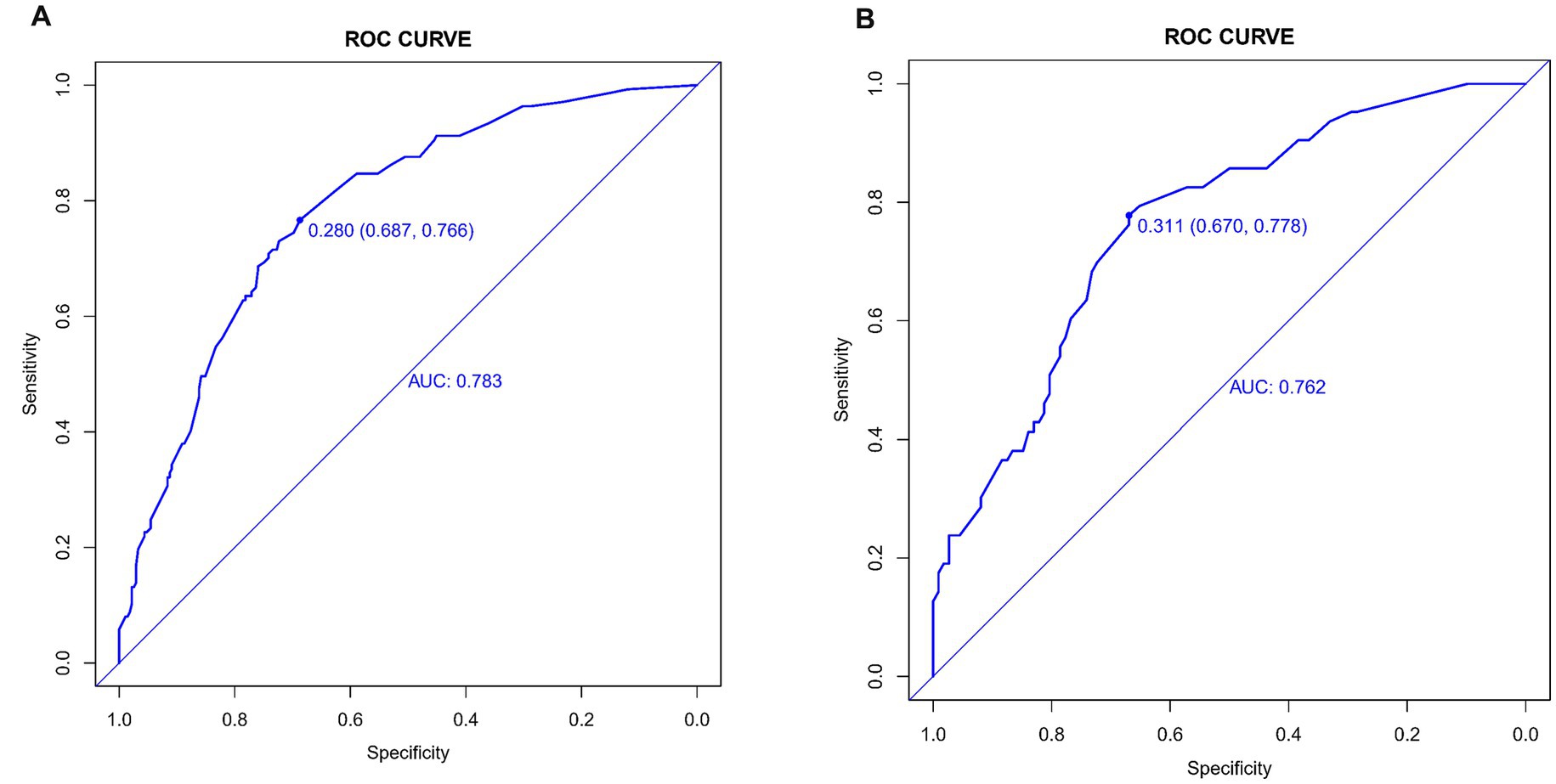 Figure 4. (A,B) Receiver operating characteristic (ROC) curves for WMH predictive model in training set (A) and validation set (B). The ROC curves plot the sensitivity against the specificity for various threshold levels.