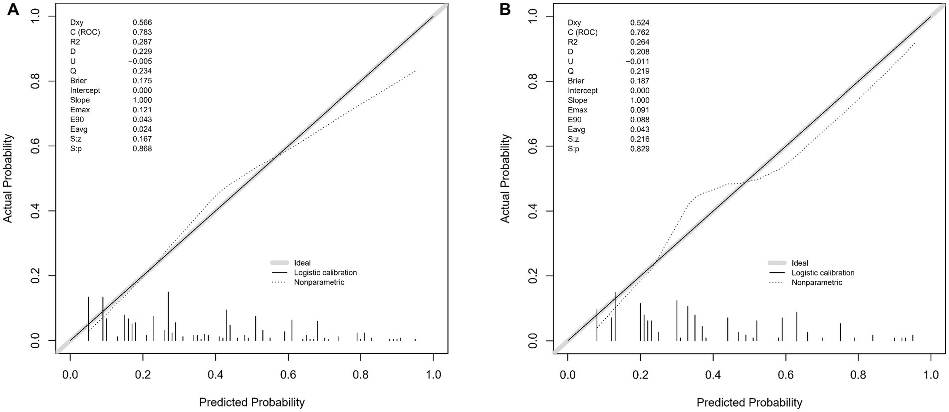 Figure 5. (A,B) These two figures present calibration plots for the WMH predictive model using the training set (A) and the validation set (B). The calibration plots compare the predicted probabilities of WMH, as provided by the nomogram, against the actual observed frequencies.