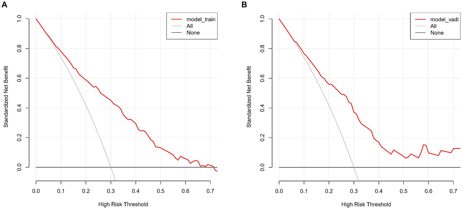 Figure 6. (A,B) These figures depict the decision curve analysis for the WMH predictive model, applied to the training set (A) and the validation set (B). The DCA graphs display the net benefit of using the predictive model at various threshold probabilities compared to two reference strategies: treating all patients or treating none. The horizontal line in each graph represents the scenario where no patients are treated (assuming all are negative), yielding a net benefit of zero. The oblique line represents the opposite extreme, where all patients are treated (assuming all are positive). The curves of the model diverge from these extremes, indicating its clinical utility by providing a balance between the benefits and drawbacks of treatment decisions based on the model’s predictions.