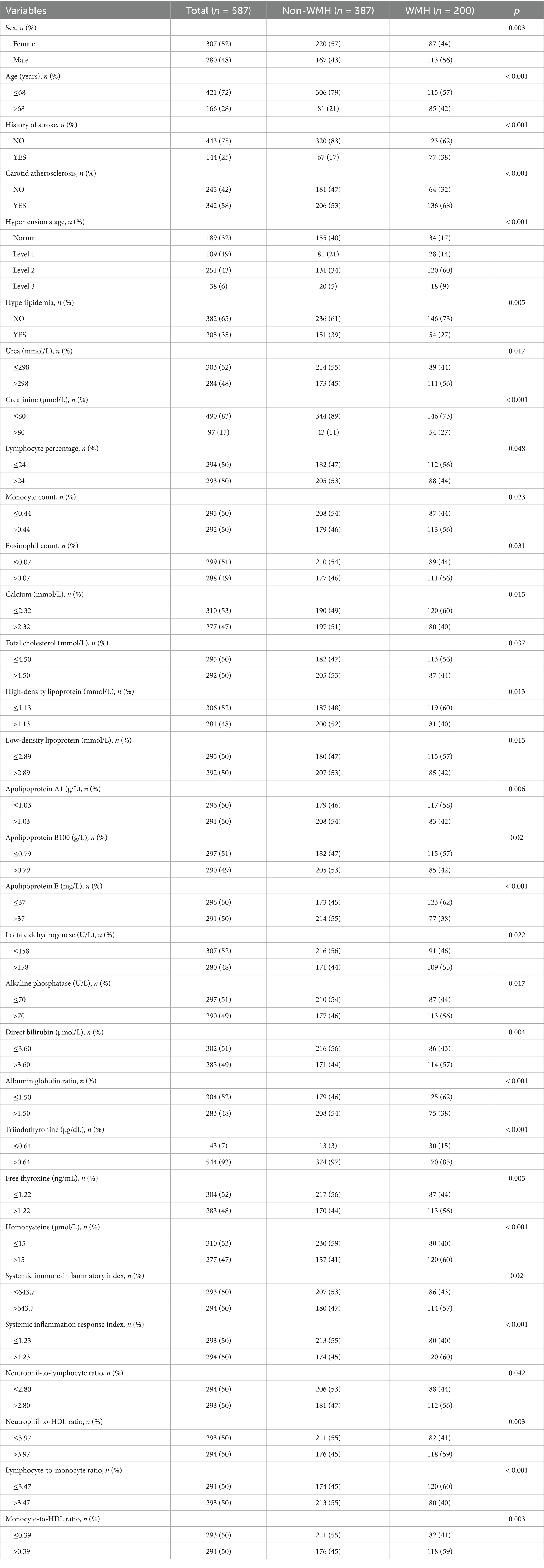 Between January 2020 and June 2022, a total of 683 patients were initially screened for eligibility. After applying exclusion criteria, 96 patients were excluded, resulting in 587 eligible participants (see Figure 1). These were divided into a training set (n = 412) and a validation set (n = 175). Baseline characteristics of the WMH group (n = 200) and non-WMH group (n = 387) are summarized in Table 1. Significant differences (p < 0.05) were found in 31 out of 88 clinical and biochemical variables. Compared with the non-WMH group, patients in the WMH group were generally older and had a higher prevalence of vascular risk factors, including hypertension, stroke history, and carotid atherosclerosis. They also showed differences in renal function, lipid profile, thyroid function, and inflammatory indices. The remaining 57 variables did not show significant intergroup differences. Detailed comparisons are presented in Table 1.