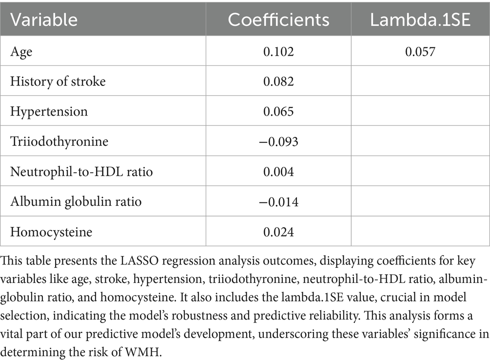In our comprehensive analysis aimed at developing a robust diagnostic model for WMH, we meticulously compiled a dataset comprising 88 variables. This extensive dataset included crucial demographic details such as age and gender, alongside comprehensive medical histories and a wide array of laboratory tests. To distill the critical variables most predictive of WMH, we employed the LASSO (Least Absolute Shrinkage and Selection Operator) regression technique using the “glmnet package” in R. We applied a 10-fold cross-validation method to fine-tune the regularization parameter λ, guided by the 1SE (one standard error) criterion (Figures 2A,B). This criterion was instrumental in maintaining a balance between simplicity and predictive accuracy of the model, thereby mitigating the risk of overfitting. Through this rigorous LASSO regression approach, we identified seven pivotal indicators: age, stroke, hypertension, triiodothyronine, neutrophil-to-HDL ratio, albumin globulin ratio, and homocysteine (Table 2). Variables retaining non-zero coefficients in the LASSO model were deemed significant, suggesting a strong association with WMH. These findings offer insights into potential pathophysiological mechanisms and contribute to the advancement of diagnostic methodologies for WMH.