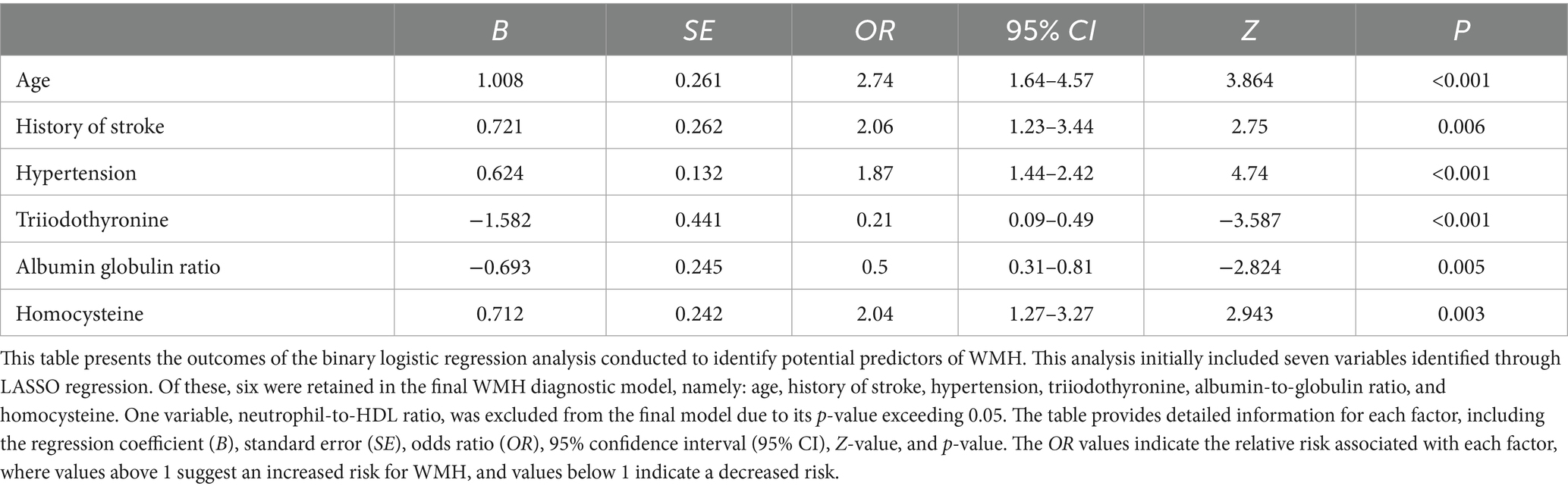 The binary logistic regression analysis integrated the seven variables identified via LASSO regression. This analysis revealed that six variables—age, stroke, hypertension, triiodothyronine, albumin globulin ratio, and homocysteine—were significantly associated with WMH risk (p < 0.05), detailed in Table 3. These findings reinforce the notion that these six variables serve as independent clinical predictors for WMH. Meanwhile, the Neutrophil-to-HDL Ratio, though included in the model, did not manifest a statistically significant correlation in this particular analysis.