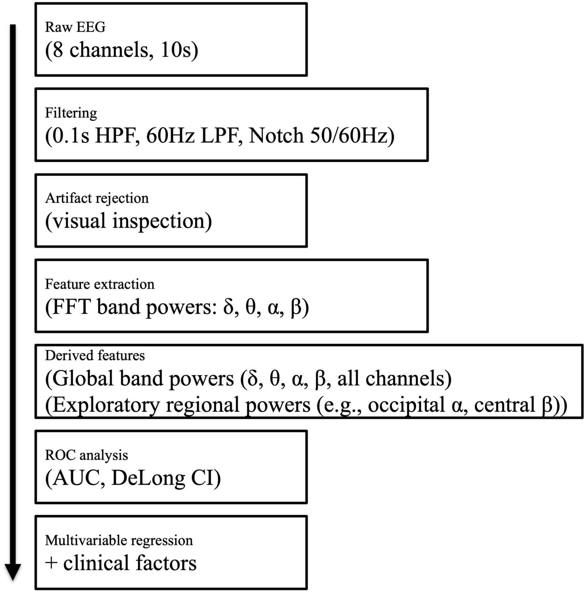Figure 1. Signal processing workflow for quantitative EEG (qEEG) analysis. Raw EEG (eight channels, 10 s epochs) was subjected to band-pass filtering (0.1–60 Hz) and notch filtering at 50/60 Hz. Artifact-contaminated segments were excluded after visual inspection. Fast Fourier transform (FFT) was applied to extract power spectral densities in the δ (1–4 Hz), θ (4–8 Hz), α (8–13 Hz), and β (13–30 Hz) bands. Global average band powers across all channels were used as the primary qEEG features. In addition, exploratory analyses assessed regional band powers (e.g., occipital α, central β). Receiver operating characteristic (ROC) analysis was performed to calculate the area under the curve (AUC) with 95% confidence intervals (CI) using DeLong’s method. Finally, multivariable regression models were constructed incorporating both qEEG-derived features and clinical variables. HPF, high-pass filter; LPF, low-pass filter.