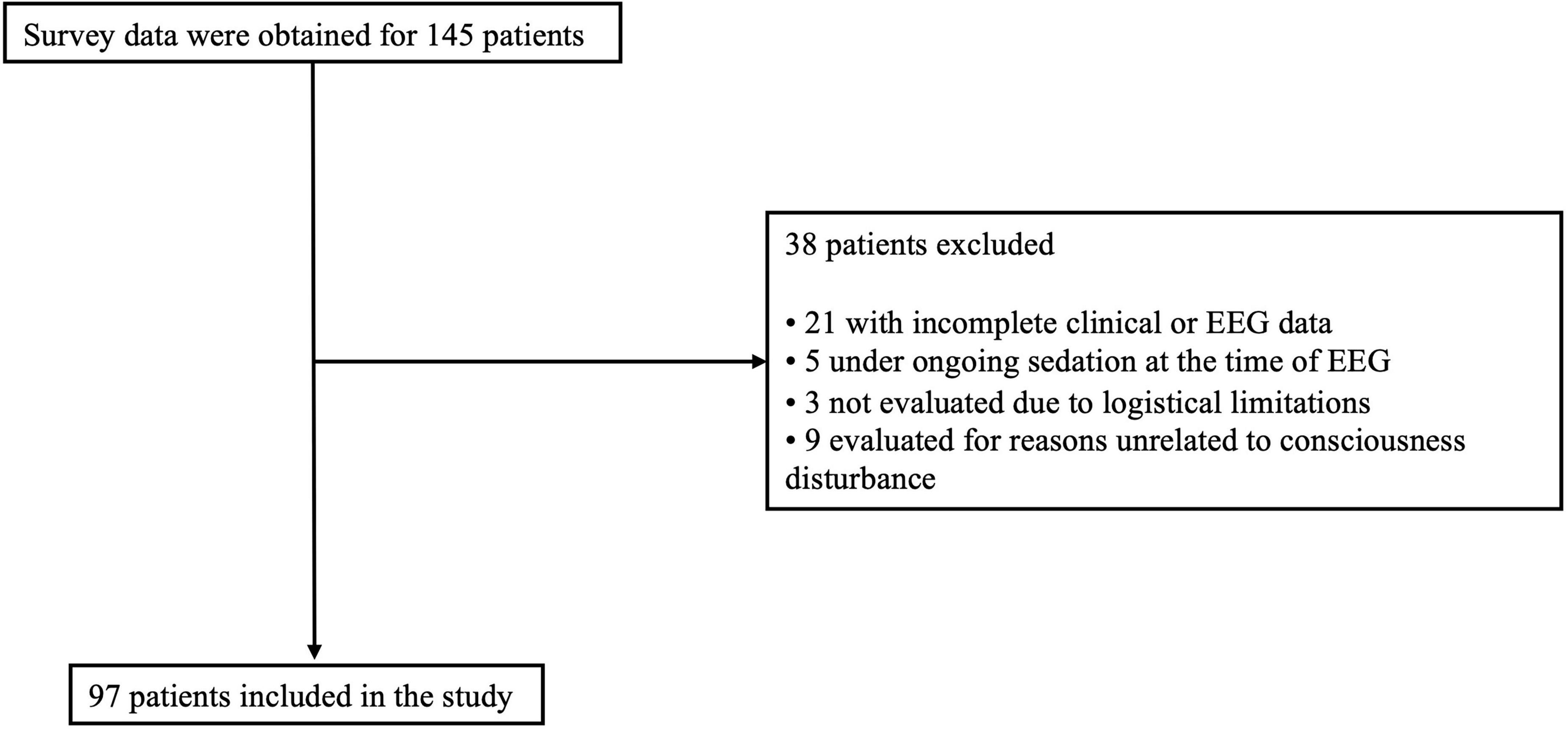 Figure 2. Flow chart describing patient selection. Survey data were obtained for 145 patients. Thirty-eight patients were excluded: 21 owing to incomplete clinical or electroencephalography (EEG) data, five because of ongoing sedation at the time of EEG, three because the EEG was not conducted owing to logistical limitations, and nine because the EEG was conducted for reasons unrelated to the evaluation of consciousness disturbance. Ultimately, 97 patients were included in the final analysis.