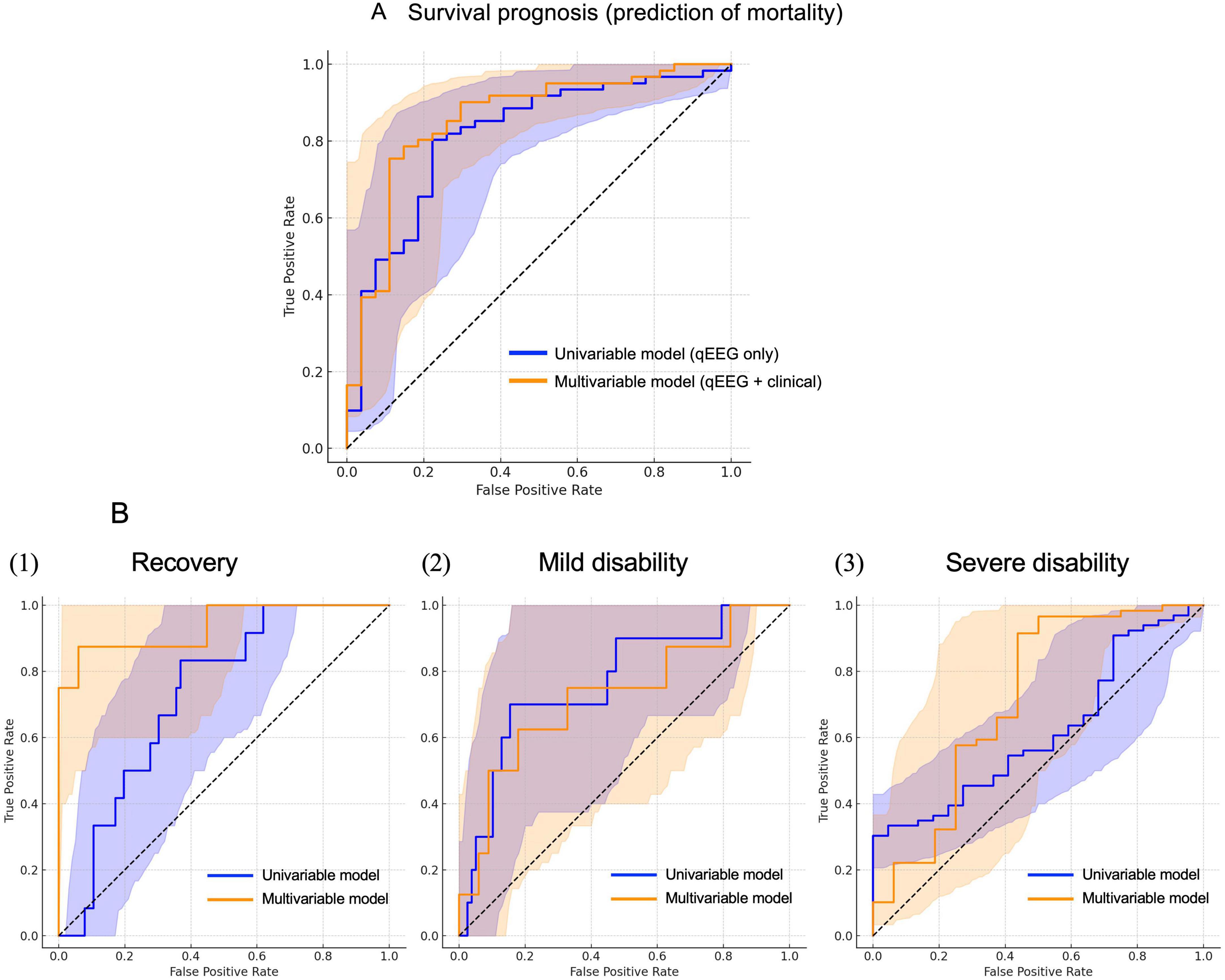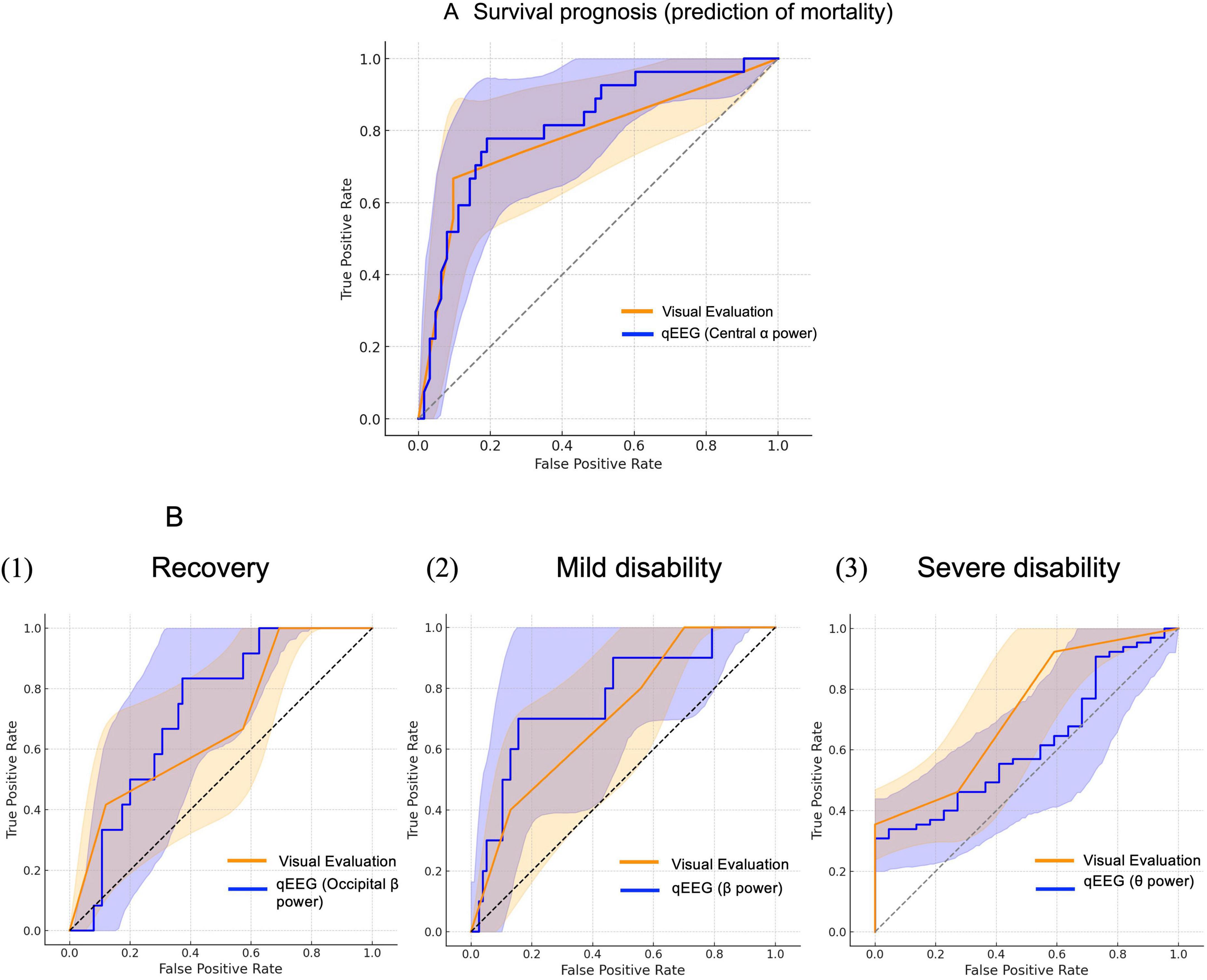 “Four ROC curve charts evaluating survival prognoses: A. Predicting mortality using visual evaluation and qEEG (central alpha power), showing a comparison of true positive and false positive rates. B. Outcomes by disability level: (1) Recovery using qEEG (occipital beta power), (2) Mild disability using qEEG (beta power), (3) Severe disability using qEEG (theta power). Each chart compares visual evaluation with qEEG, highlighting visual evaluation in orange and qEEG in blue. The curves are surrounded by shaded confidence intervals.”