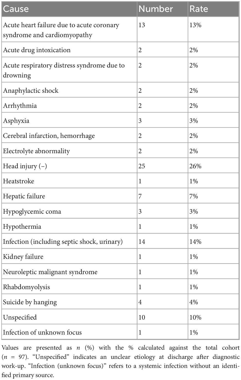 Primary etiologies included post-anoxic encephalopathy following cardiac arrest, ischemic and hemorrhagic strokes, metabolic/toxic encephalopathy, and other causes. The distribution by etiology is summarized in Table 1.