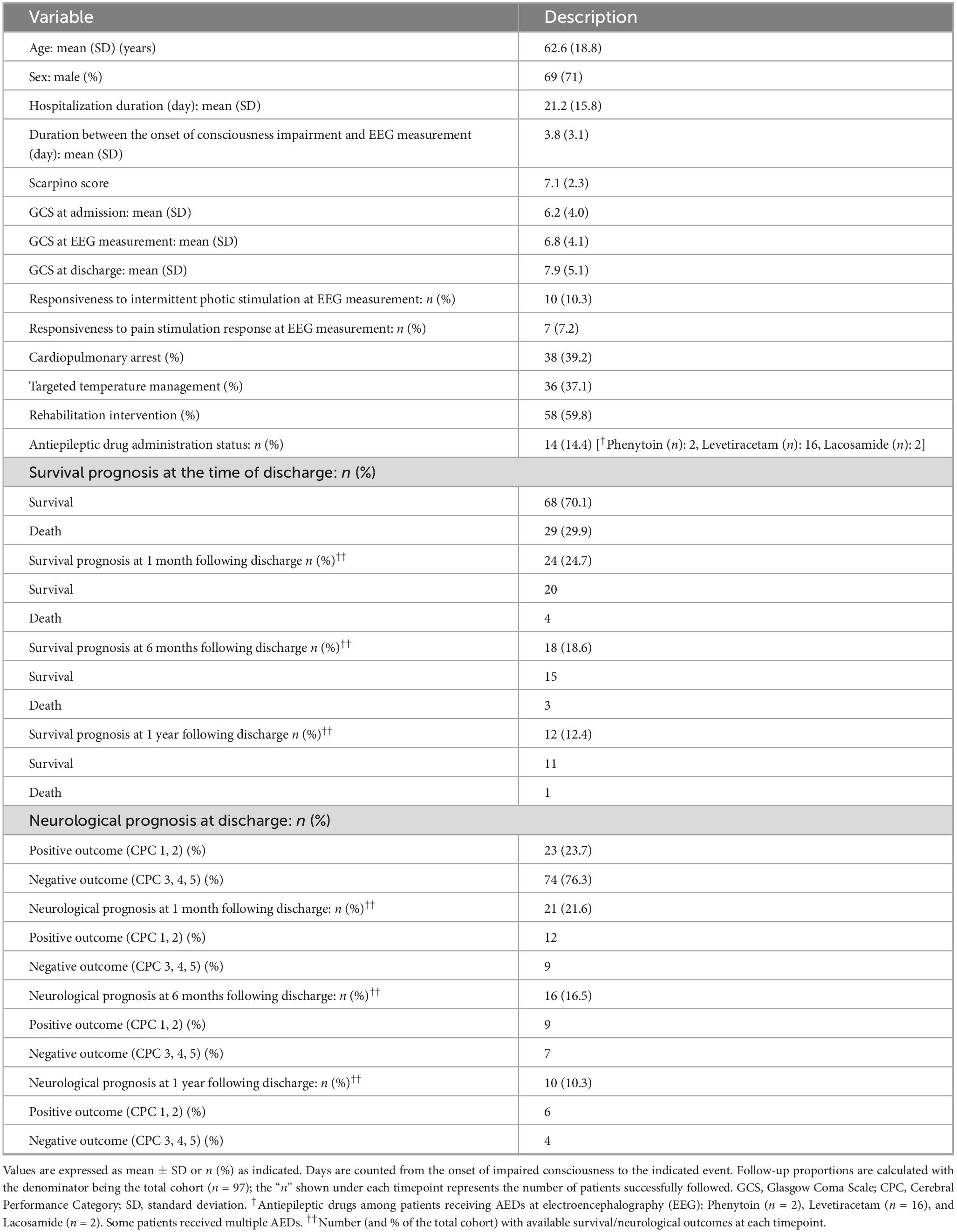 A total of 145 patients were initially screened. Of these, 48 were excluded: 21 due to incomplete clinical or EEG data, five because of ongoing sedation at the time of EEG, three not evaluated because of logistical limitations, and nine because EEG was conducted for reasons unrelated to consciousness disturbance. Thus, 97 patients were included in the final analysis (Figure 2 and Supplementary Table 1). The demographic data are summarized in Table 2, and the primary illness distribution is shown in Table 1. For 38 deceased participants, survival duration (in days) from EEG examination to death was recorded.