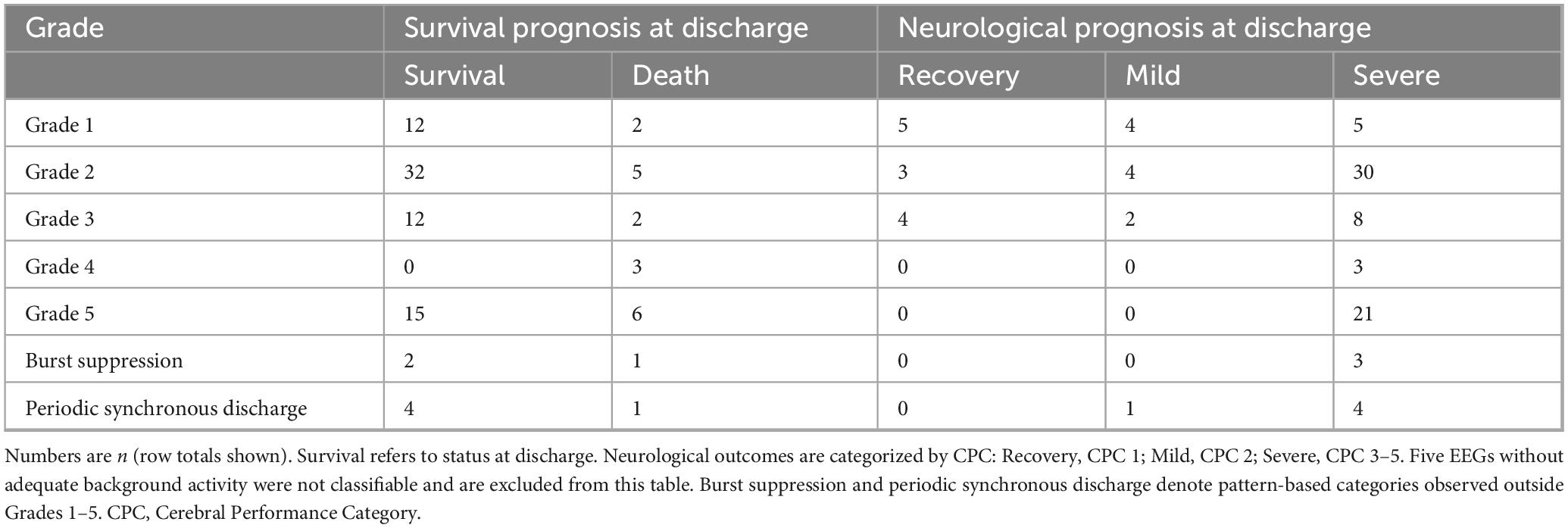 To evaluate the prognostic utility of the visual EEG grading described by Markand (1984), based on Hockaday et al. (1965), Prior (1973), we analyzed two primary outcomes: survival (classified as survival or death) and neurological prognosis [categorized using CPC scores: CPC 1 (recovery to pre-illness state), CPC 2 (mild disability), and CPC 3–5 (severe disability)].