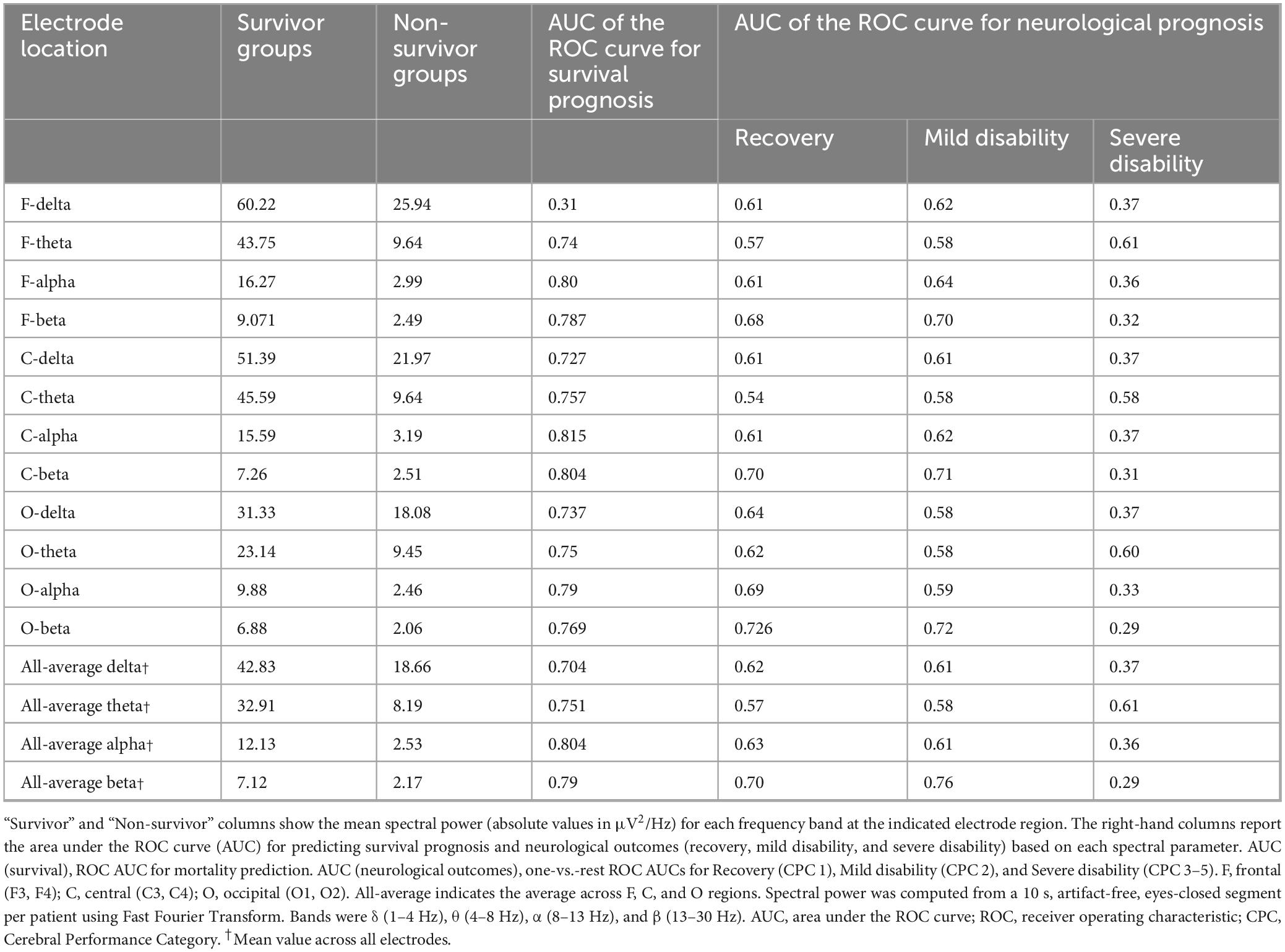Table 4. Mean spectral values for each frequency band at each electrode site in the survival and deceased groups, along with AUC values from ROC analysis for predicting mortality and neurological prognosis.