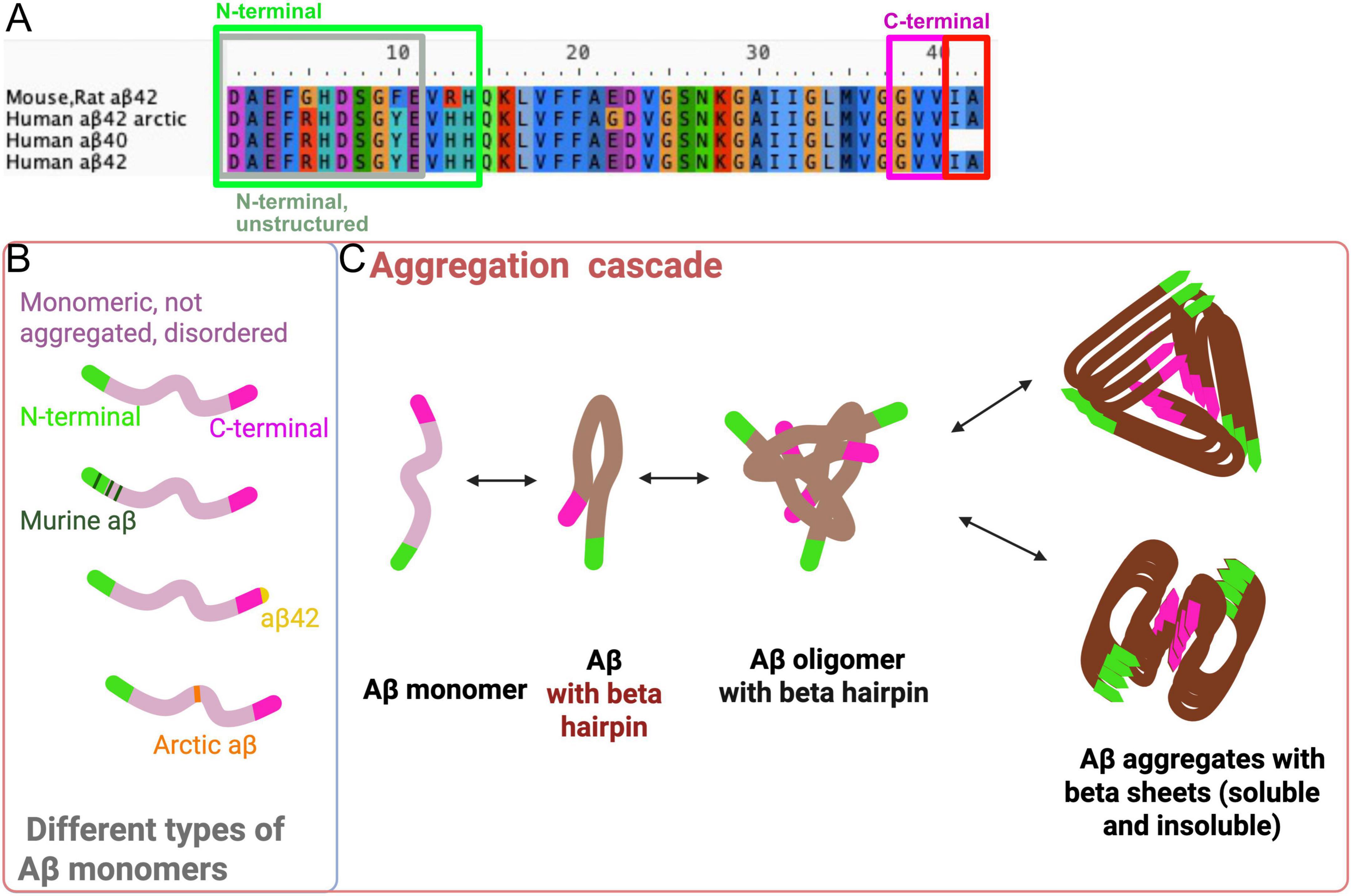 Figure 1. Different types of monomers and the Aβ aggregation cascade. (A) Sequence alignment of human and mouse/rat Aβ highlighting differences at amino acid (AA) position 5, 10 and 13. From AA 14 to 42, human and mouse Aβ are identical. The Arctic mutation, is for instance located at AA 22. The first 10–11 N-terminal AAs are unstructured, making it difficult to determine their structure in crystallization experiments, so they can only be studied in structures determined by NMR (see Figure 2). (B) There are different types of Aβ monomers, each with varying tendencies to aggregate. These monomers can differ in length (e.g., Aβ1-40, Aβ3-40 and Aβ1-42) and can contain mutations, such as the Arctic mutation, which enhances the aggregation properties. (C) Schematic overview of the Aβ aggregation cascade. Unstructured monomers misfold and begin to aggregate, initially forming small aggregates that adopt a beta-hairpin structure. As these aggregates grow larger, they twist into more ordered conformations, ultimately forming beta-sheets. Various aggregate folds have been identified (as seen in Figure 2), however, in most structures, the N-terminus remains more accessible for antibody binding, unless the N-terminus is truncated. In smaller aggregates, the C-terminus may also be available for binding. Created with Biorender.com.