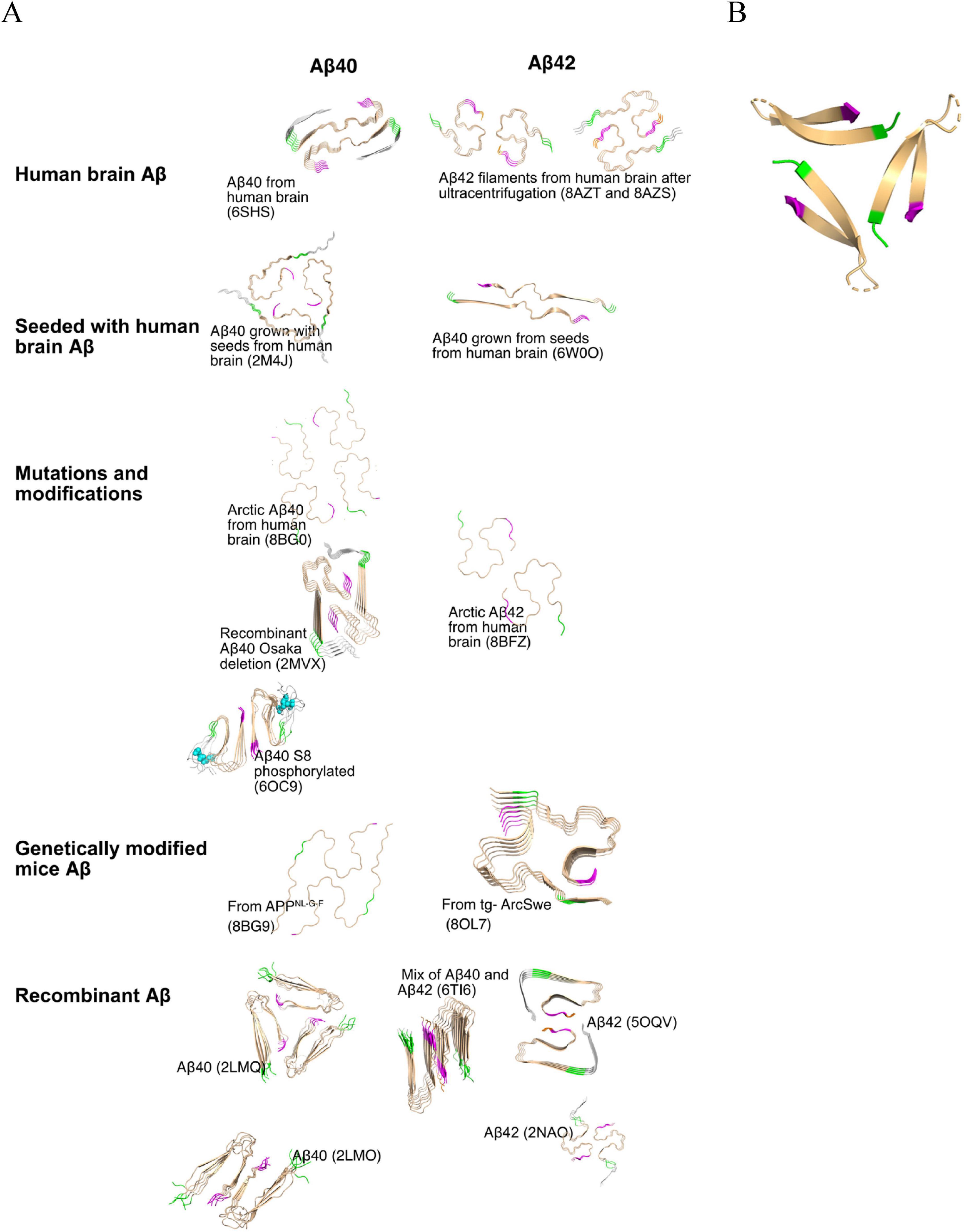 Figure 2. (A) Structures of Aβ fibrils with different origins. This panel displays the structures of Aβ fibrils derived from different origins, as indicated on the figure. The following PDB structures are shown: Human brain Aβ40 (6SHS), Human brain Aβ42 (8AZT), Aβ40 grown with seeds from human brain (2M4J), Aβ42 grown with seeds from human brain (6W0O), arctic Aβ40 from human brain (8BG0), recombinant Aβ40 with Osaka deletion (2MVX), arctic Aβ40 S8 phosphorylated (6OC9), arctic Aβ42 from human brain (8BFZ), Aβ40 from APPNL–G–F mice (8BG9), Aβ42 from tg-ArcSwe mice (8OL7), recombinant Aβ40 (2LMQ and 2LMO), recombinant Aβ42 (5OQV and 2NAO) and mix of Aβ40 and Aβ42 (6Ti6). The N-terminal amino acids “VHH” are colored in green, and the C-terminal amino acids “GVV” are colored pink, as detailed in Figure 1A. (B) The structure of a stabilized Aβ oligomer containing a beta-hairpin conformation (PDB: 6cg5 visualized using PyMOL). The formation of such oligomers is an early step in the Aβ aggregation cascade. The beta-hairpin motif reflects a misfolded conformation that may serve as a seed for further aggregation. These oligomeric species play a critical role in the progression of Alzheimer’s disease, as they exhibit highly neurotoxicity and can significantly disrupt in cellular function (Xiao et al., 2015).