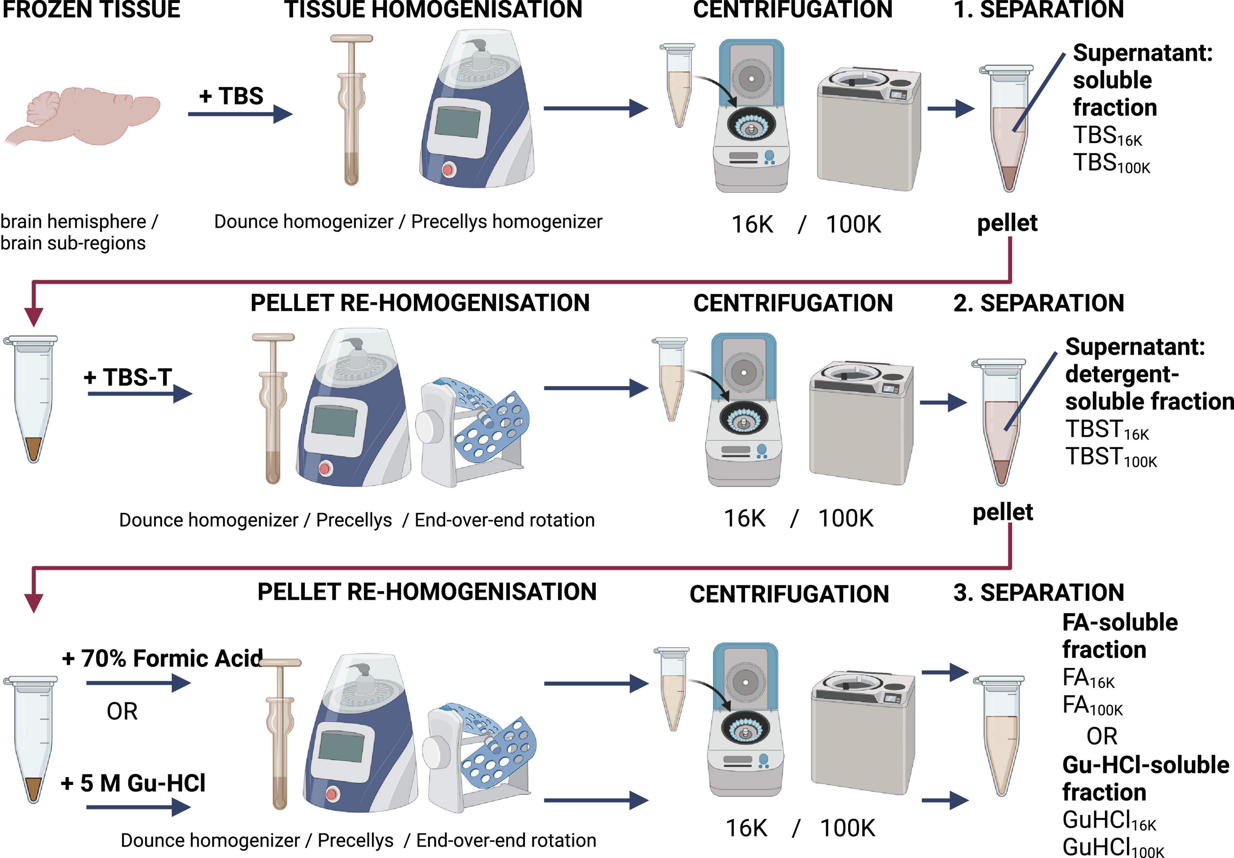 Figure 3. Schematic overview of a recommended homogenization and centrifugation procedure for preparing samples for analysis using TBS (Tris-buffered saline), TBST (TBS with addition of 1% Tritron-X100), and FA (formic acid) or GU-HCl (guanidine hydrochloride).