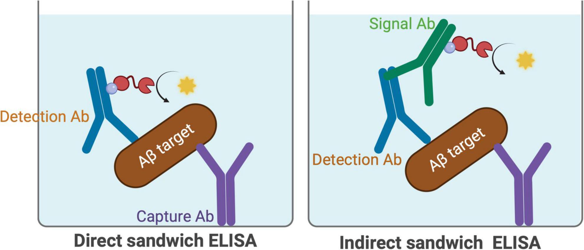 Simple strategies to slightly enhance the signal in an ELISA could be using a polyclonal antibody as the detection antibody. However, a polyclonal antibody can only bind to a few sites on an Aβ molecule due to its small size, resulting only in a slight signal amplification (Figure 5). However, if the polyclonal antibody binds to a small epitope of Aβ, amplification may not occur. None of the polyclonal antibodies listed in Table 1 are designed to bind large regions of Aβ, but they are effective in targeting specific small epitopes. A greater amplification is possible using a polyclonal antibody as a signal antibody in indirect sandwich ELISAs.