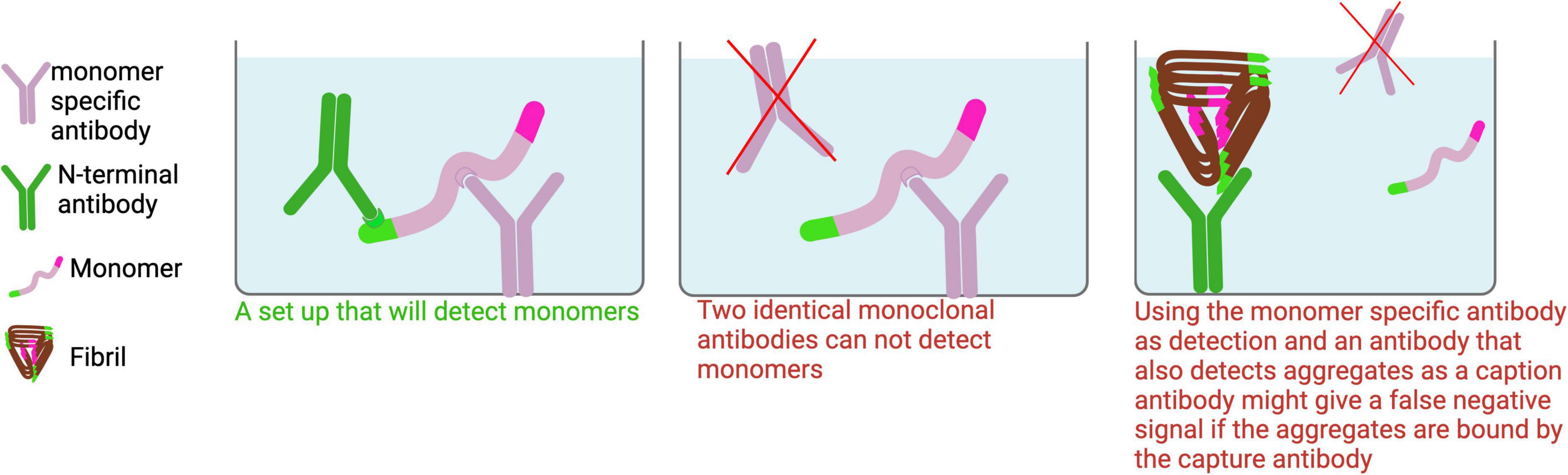 To detect monomers in an ELISA, the same monoclonal antibody cannot be used for both capture and detection, as a monomer only has one accessible binding site (Figure 5). For detecting monomers of different isoforms, a monomer-selective capture antibody (e.g., m266, Table 1) should be paired with a C-terminal specific antibody (e.g., H31L21 or 1A10) targeting the desired Aβ isoform. This combination ensures specific detection of monomers while avoiding cross-reactivity with aggregates. If the sample contains both aggregates and monomers, using a non-selective capture antibody that binds to both forms may result in preferential binding to aggregates, which could block monomer detection and lead to underestimation of monomer levels.