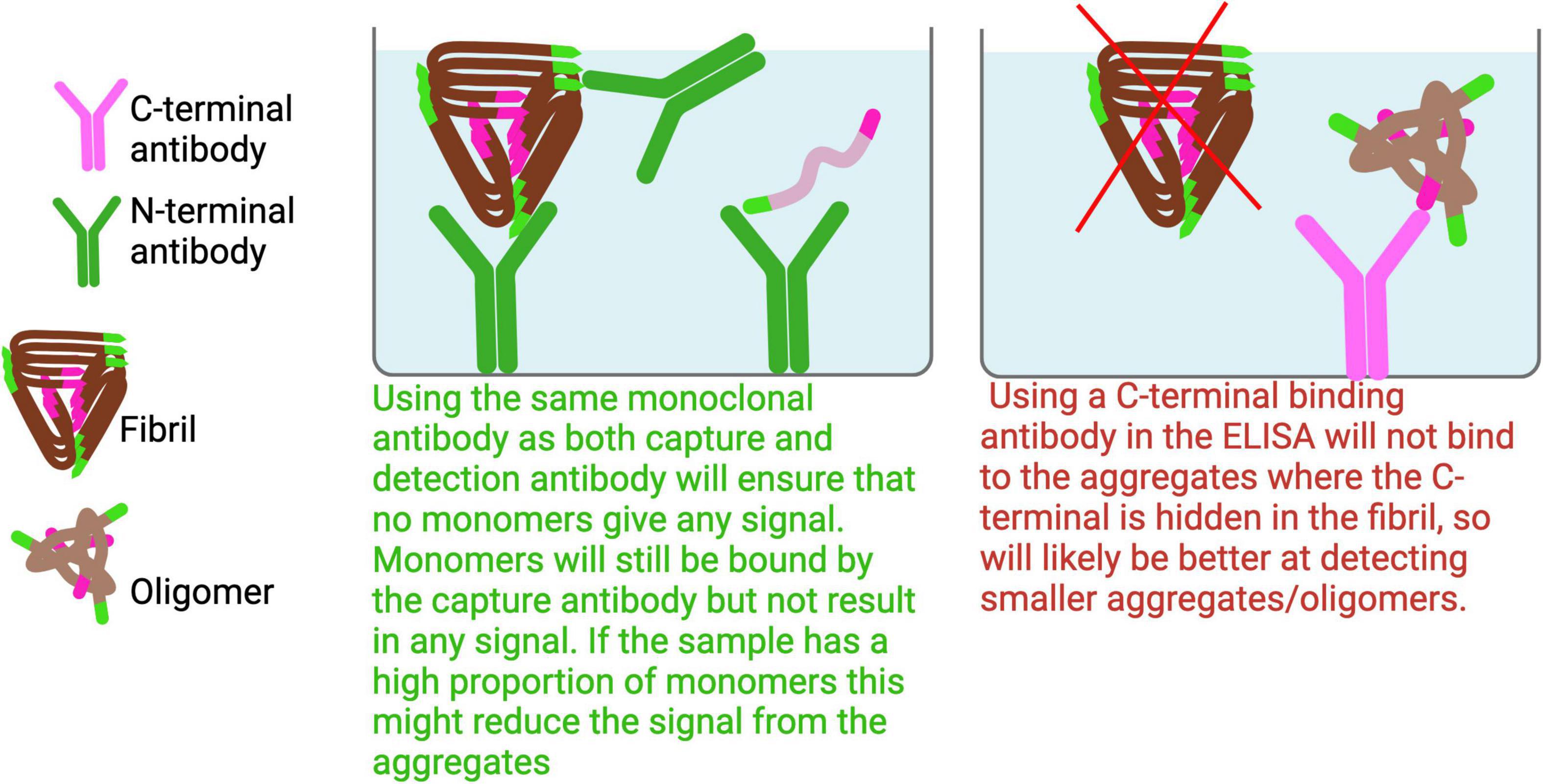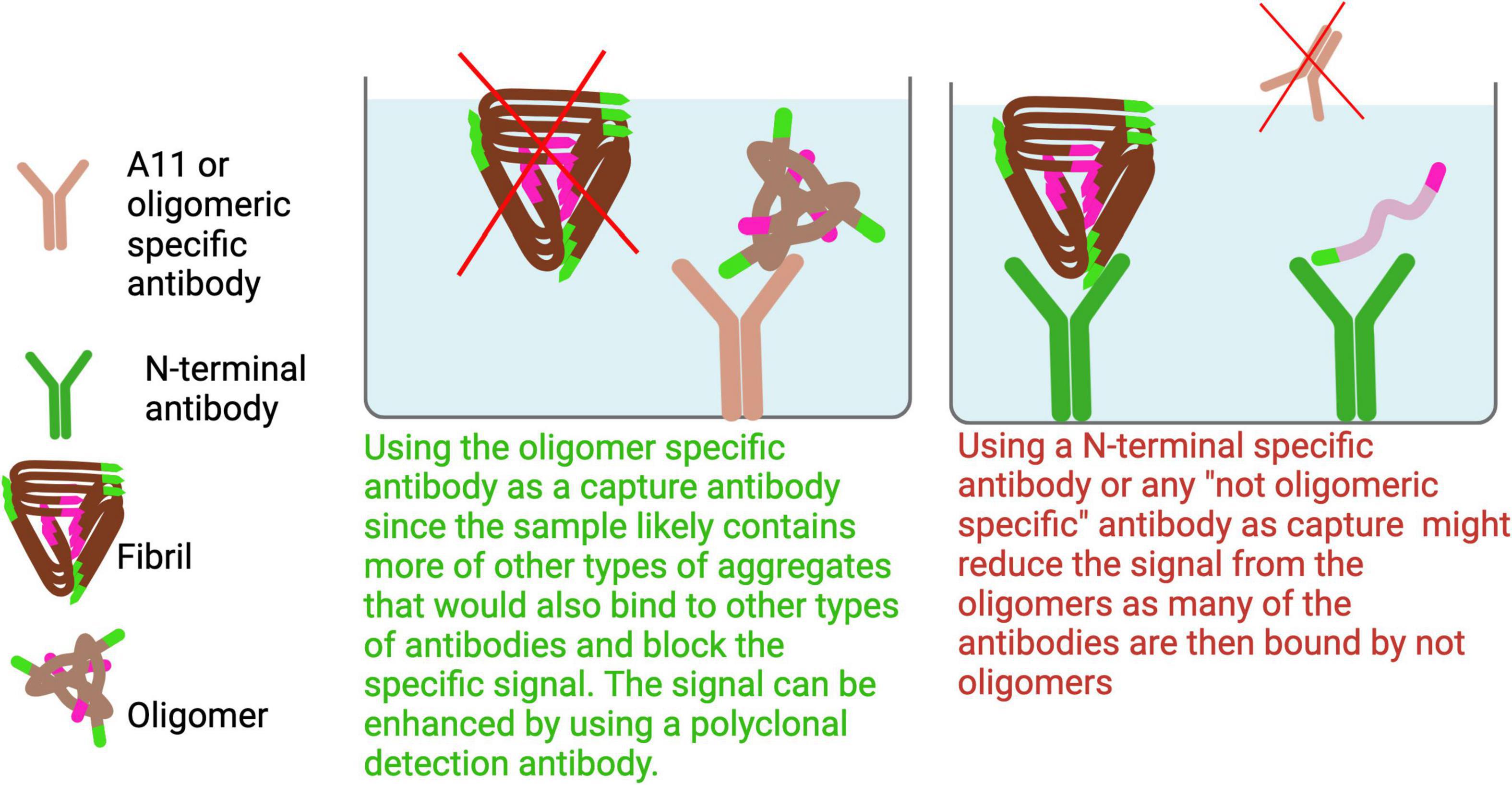 Figure 7. To specifically detect oligomers, an oligomer-selective antibody should be used as the capture antibody to avoid binding larger aggregates that could dilute the signal. Since the C-terminal region is generally more exposed in smaller aggregates and oligomers, using a C-terminal antibody for both capture and detection can enhance selectivity for these forms. Additionally, high-speed centrifugation can enrich for soluble oligomers by pelleting larger aggregates.