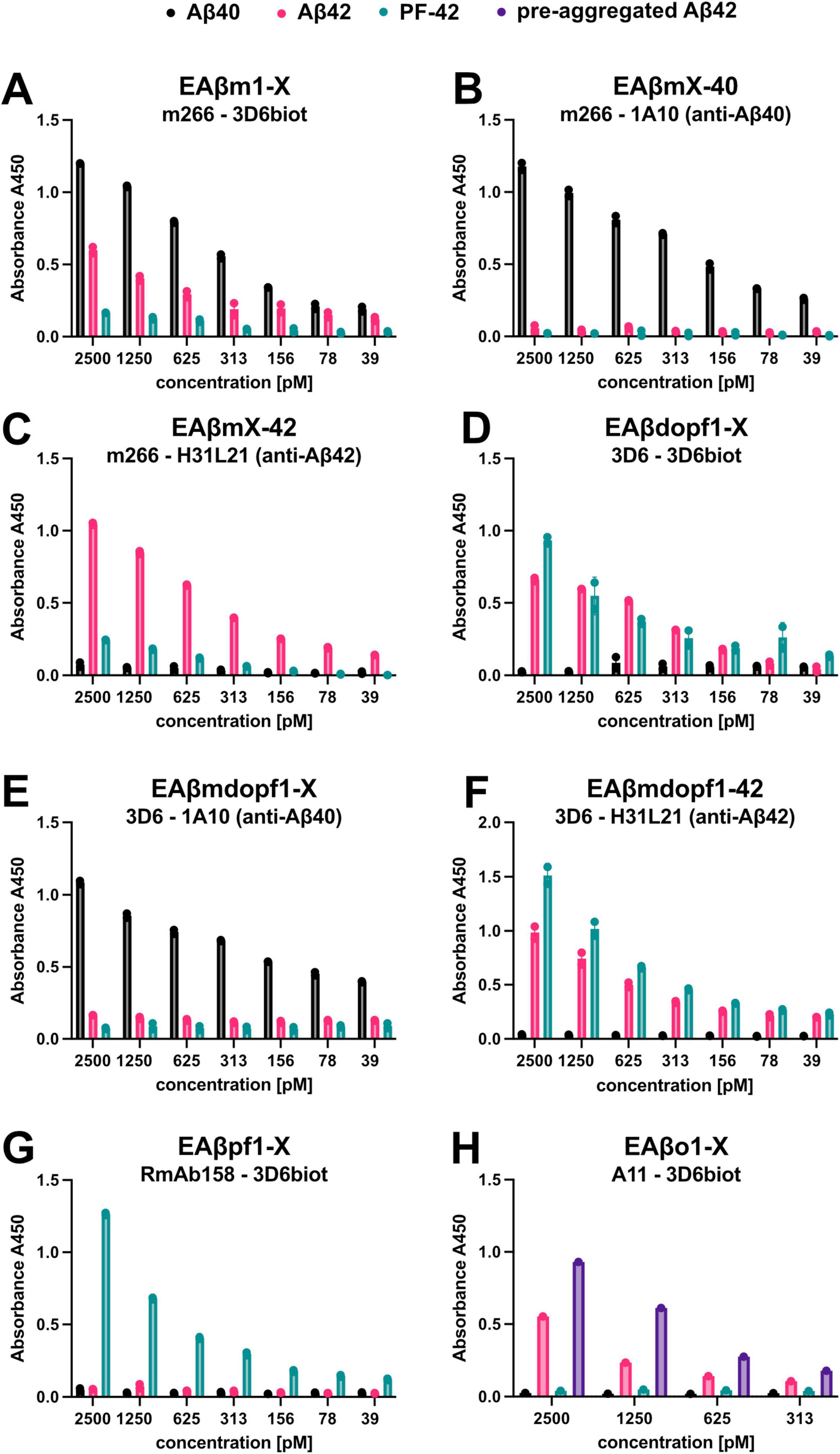 Figure 8. Well-characterized ELISA setups for detecting distinct Aβ species and aggregates. (A–H) Selected ELISA setups from Table 2 were evaluated for their ability to detect various Aβ species. Standard curves were generated using synthetic preparations of Aβ40 monomers, Aβ42 monomers, Aβ42 protofibrils (PF-42), and pre-aggregated Aβ42 (only in Figure 8H), but the results indicates that at the Aβ42 monomer standard curve does not stay monomeric. The abbreviations of the ELISA setups and the corresponding capture and detection antibodies are indicated in each graph. Data represent the mean with standard deviation of duplicates.