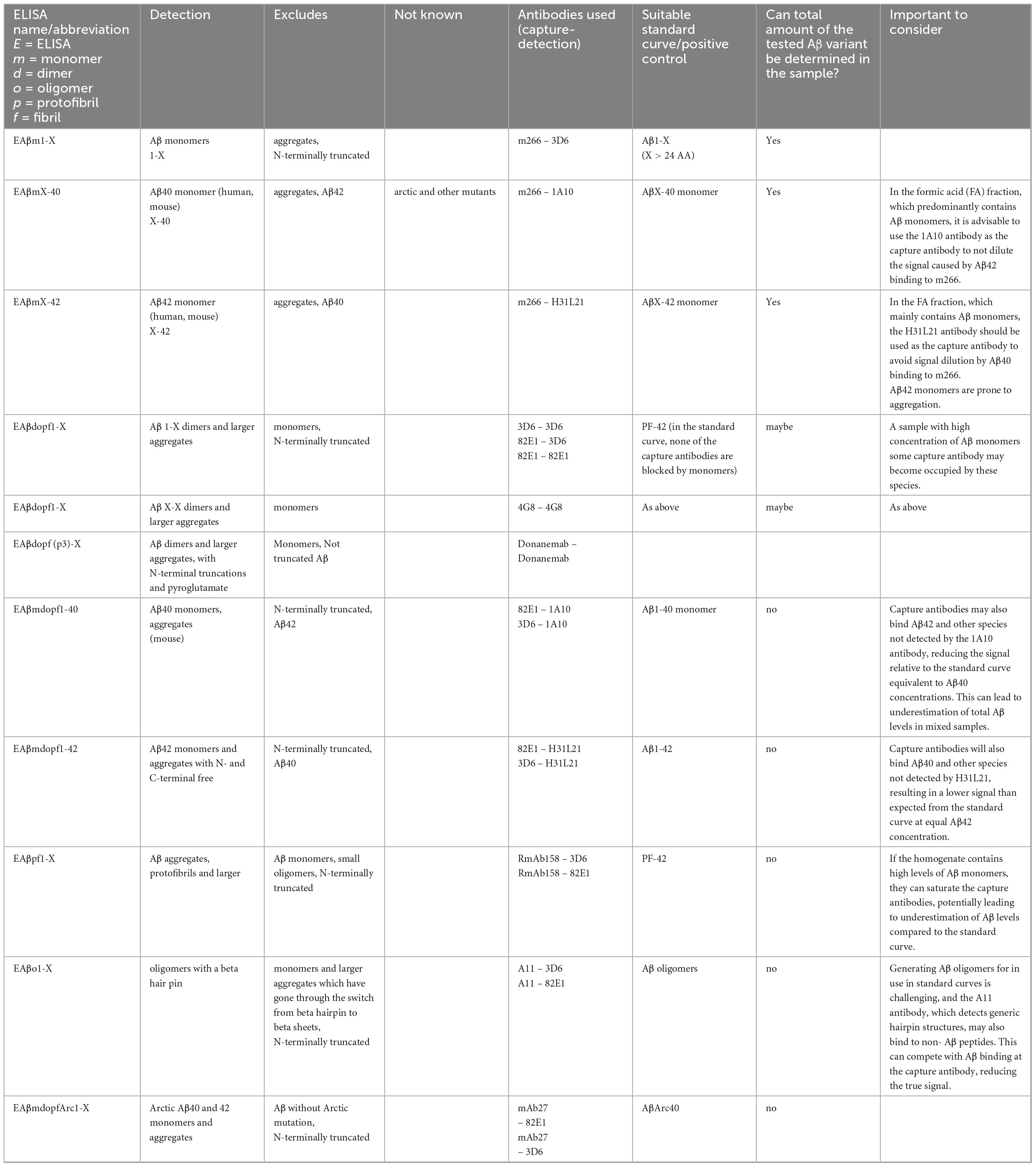 In this paper, we will outline effective methods for preparing tissue homogenate samples from Alzheimer’s disease mouse models for ELISA. We will focus on the composition and structure of various types of Aβ aggregates, with an emphasis on selecting the most appropriate antibodies for both coating and detection in an Aβ ELISA. Additionally, we will provide useful tips and tricks for optimizing ELISA setups to improve specificity in detecting different Aβ aggregate forms and cellular locations.