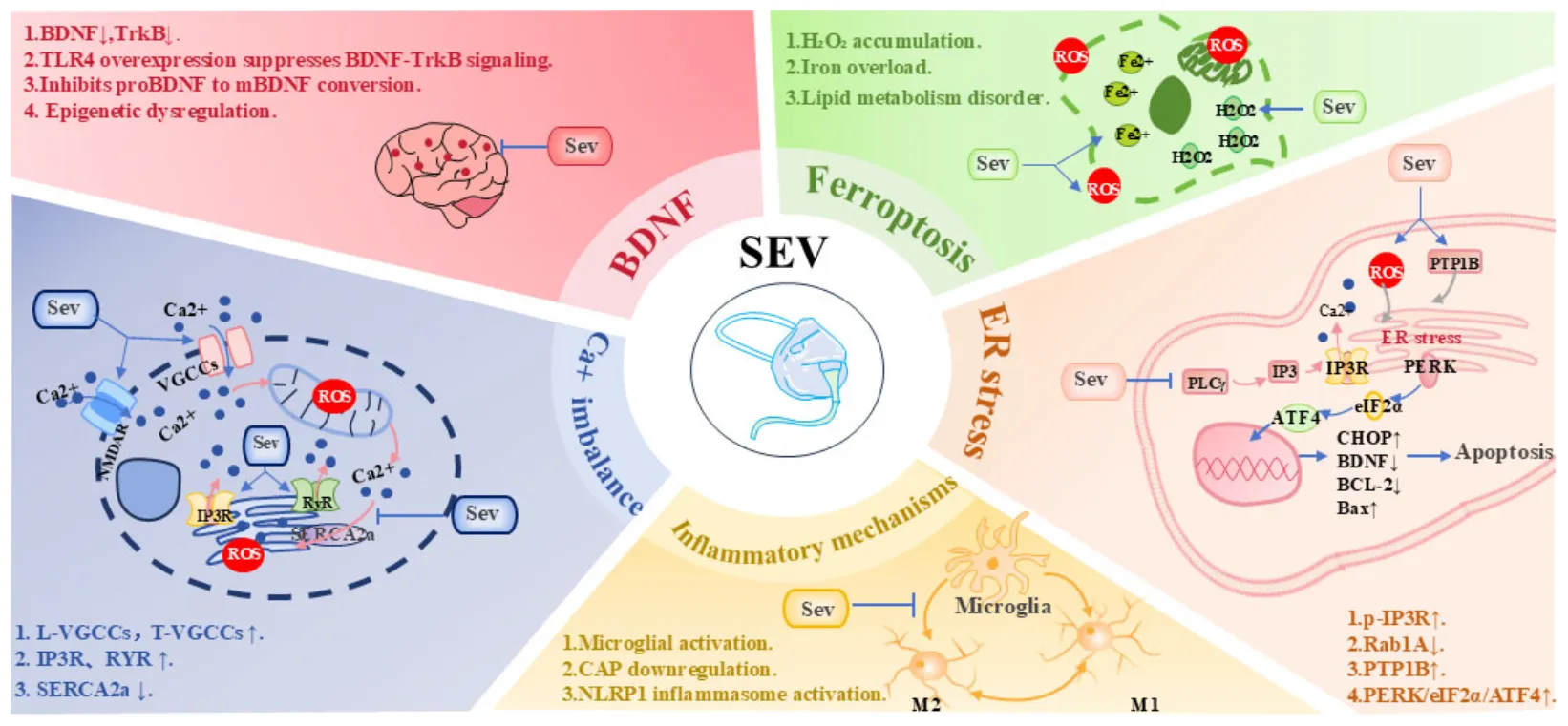 Graphical Abstract. Mechanisms of sevoflurane neurotoxicity. ATF4, Activating Transcription Factor 4; BDNF, Brain-Derived Neurotrophic Factor; CAP, Cholinergic Anti-inflammatory Pathway; eIF2α, Eukaryotic Initiation Factor 2α; IP3R, Inositol 1,4,5-TrisPhosphate Receptor; L-VGCCs, L-type Voltage-Gated Calcium Channels; mBDNF, Mature BDNF; NLRP1, NACHT, LRR, and PYD Domains-Containing Protein 1; PERK, PKR-like ER Kinase; p-IP3R, Phosphorylated IP3R; ProBDNF, Proprotein form of BDNF; PTP1B, Protein Tyrosine Phosphatase 1B; Rab1A, Ras-associated binding protein 1A; RyR, Ryanodine Receptor; Sev, Sevoflurane; SERCA2a, Sarco/Endoplasmic Reticulum Ca2+-ATPase 2a; TLR4, Toll-Like Receptor 4; TrkB, Tropomyosin receptor kinase B; T-VGCCs, T-type Voltage-Gated Calcium Channels.