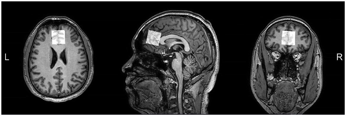 Figure 1. T1-weighted images showing MRS voxel placed in the mPFC on axial, sagittal, and coronal sections.