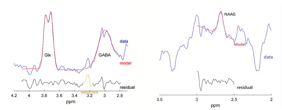 To ensure the quality of the spectrum data, metabolite levels were included in further statistical analysis only when the fitting error limits of GABA+/Cr and Glx/Cr were less than 15%, but NAAG, due to its relatively low concentration, used data with fitting error limits of less than 25%. The Example Fits for Worst-Case Scenarios can be found in the Supplementary Figure 1.