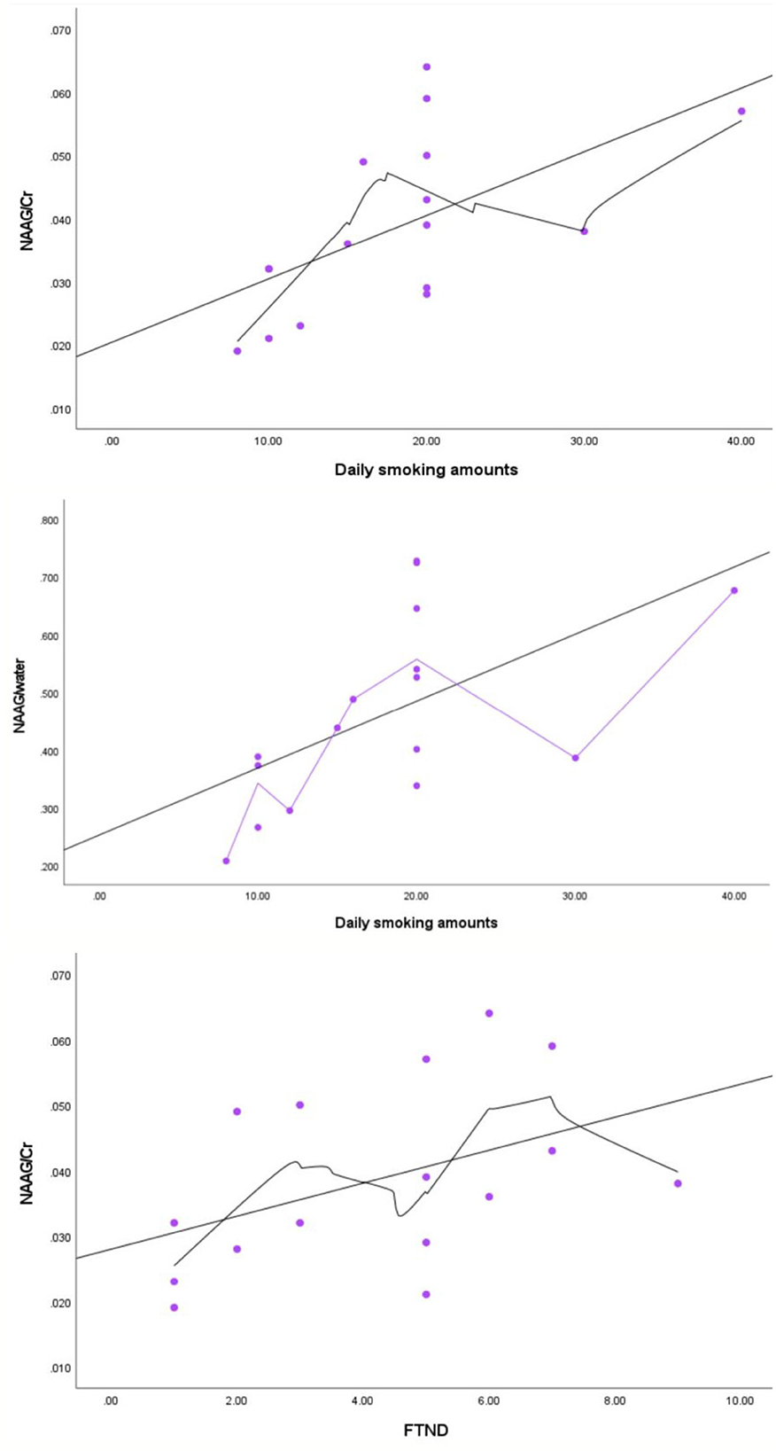 Figure 3. Correlations of the NAAG level with the daily smoking amounts and the FTND score in smokers.