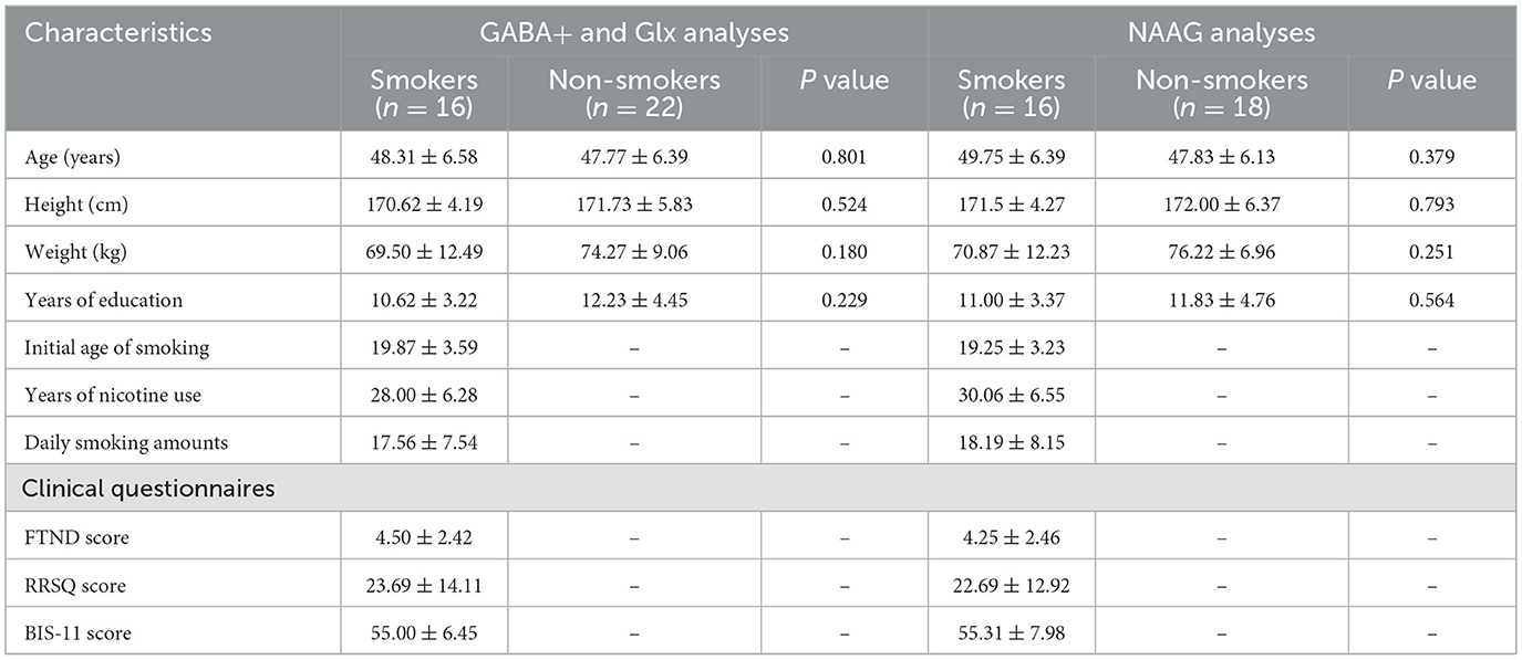 The SPSS 22.0 software was used for statistical analysis of clinical data of smoker and HC groups in our study. Normal test was conducted using the Kolmogorov-Smirnov test before analysis; If the variables meet the normal distribution criteria, the independent sample t-test is used, otherwise the non-parametric test is used. The clinical characteristic variables (age, height, weight, education level, daily smoking amount, initial of smoking age, FTND score, BIS-11 score, and RRSQ score) of smoker and HC groups were compared, and the measurement data were expressed as mean ± standard deviation (X ± SD). The levels of metabolites (GABA+, Glx, NAAG (Refer to water or tCr), tCr, tNAA, tCho, and mI) in the mPFC between the smoking group and the control group were also compared, and p < 0.05 was considered statistically significant. And then, the correlation between GABA+, Glx, NAAG levels (Refer to water or tCr) and clinical characteristics assessment scales (including daily smoking volume, smoking age, FTND score, RRSQ score, and BIS-11 score) was analyzed by Spearman criteria. Finally, multiple comparisons were corrected using false discovery rate (FDR) control at 0.05 within each group of correlations.