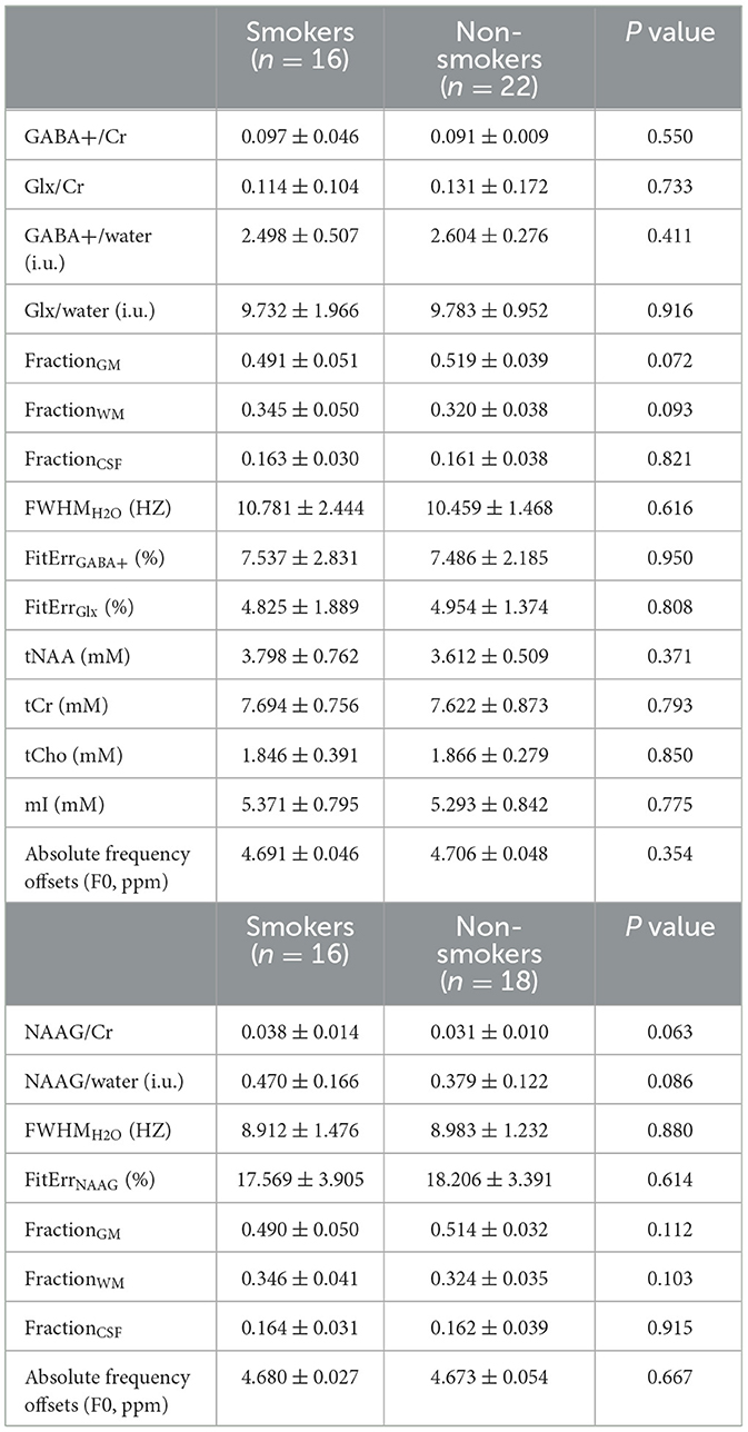 Three subjects (2 smoker and 1 non-smoker subjects), of which two with brain-based diseases and one with alcohol dependence, were excluded. Subjects with poor data quality were also excluded (including 3 smoker and 1 non-smoker subjects in GABA+ and Glx level analyses; 3 smoker and 5 non-smoker subjects in NAAG level analyses). The GABA+ and Glx levels were finally analyzed in 16 smokers and 22 age- and sex-matched non-smokers. The NAAG levels were analyzed in 16 smokers and 18 age- and sex-matched non-smokers. The demographic characteristics of the control group and the smoking population are presented in Table 1. Results indicated no significant differences in age, height, weight, or years of education between the two groups. The FTND scores revealed that the smokers included in this study had moderate nicotine dependency levels (mean FTND scores > 4.0).