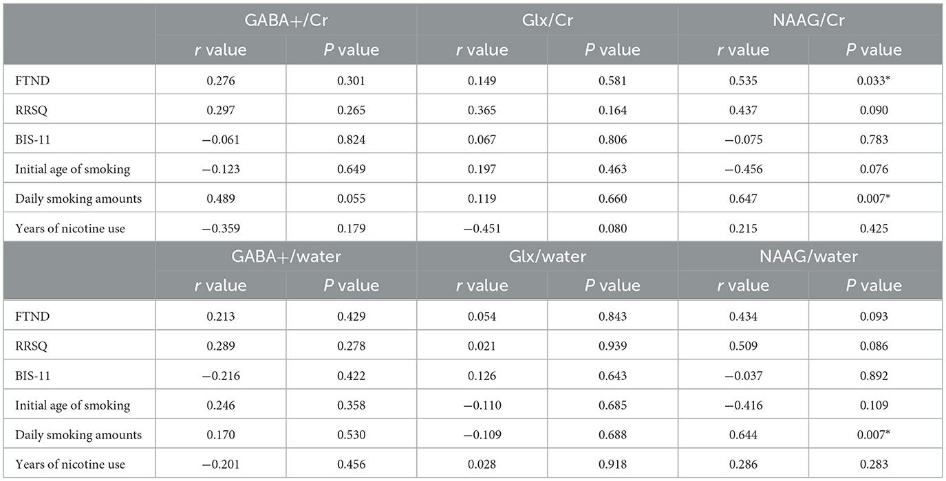 The NAAG/Cr level was positively correlated with the FTND score (r = 0.535, p = 0.033) and daily smoking amounts (r = 0.647, p = 0.007). Meanwhile, the NAAG/water level was positively correlated with daily smoking amounts (r = 0.644, p = 0.007). However, no significant correlation was found between NAAG (Refer to water or tCr) levels and the years of nicotine use, the initial ages of smoking, the BIS-11 score or the RRSQ score. No significant correlation was also found between GABA+ or Glx (Refer to water or tCr) levels and the clinical scales (see Table 3 and Figure 3). The NAAG/Cr (p = 0.042) and NAAG/water (p = 0.042) levels were still positively correlated with the daily smoking amount even after FDR correction (Supplementary Table 2). While the correlation between NAAG/Cr and the FTND score became unsignificant after correction (p = 0.099).