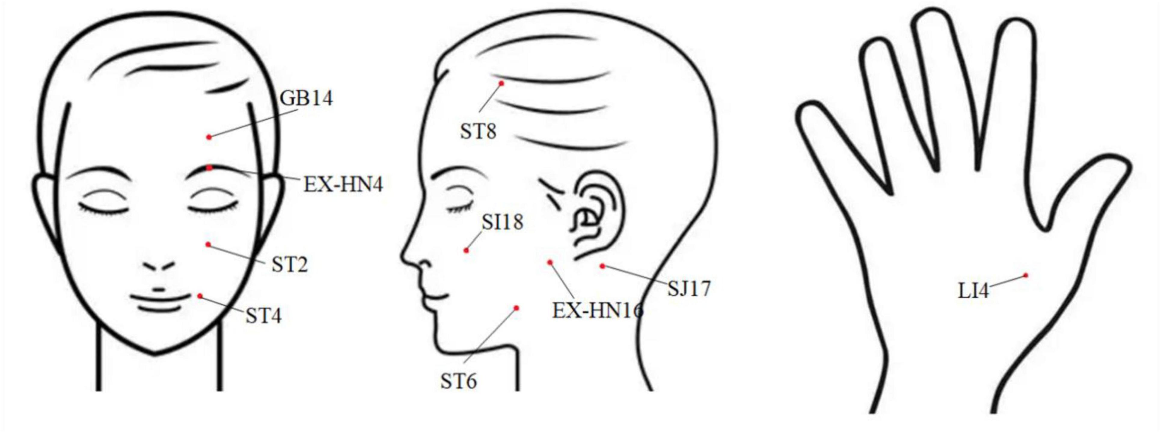 Procedure: After disinfecting the local skin, patients were placed in a supine position. Disposable acupuncture needles (0.25 mm × 25–40 mm; Wujiang Yunlong Medical Equipment Co., Ltd., Su Jizhun 20142200226) were used. ST2: inserted perpendicularly 10–15 mm. GB14: inserted 20–25 mm toward the EX-HN4 region. ST8: inserted horizontally 10–15 mm in an upward direction. SI18: inserted obliquely 10–15 mm toward the anterior aspect of the lower root of the ear on the affected side. SJ17: inserted perpendicularly 12–20 mm. SI18: inserted perpendicularly 12–20 mm. ST6 and ST4: inserted bidirectionally 15–20 mm. LI4: inserted perpendicularly 12–20 mm.