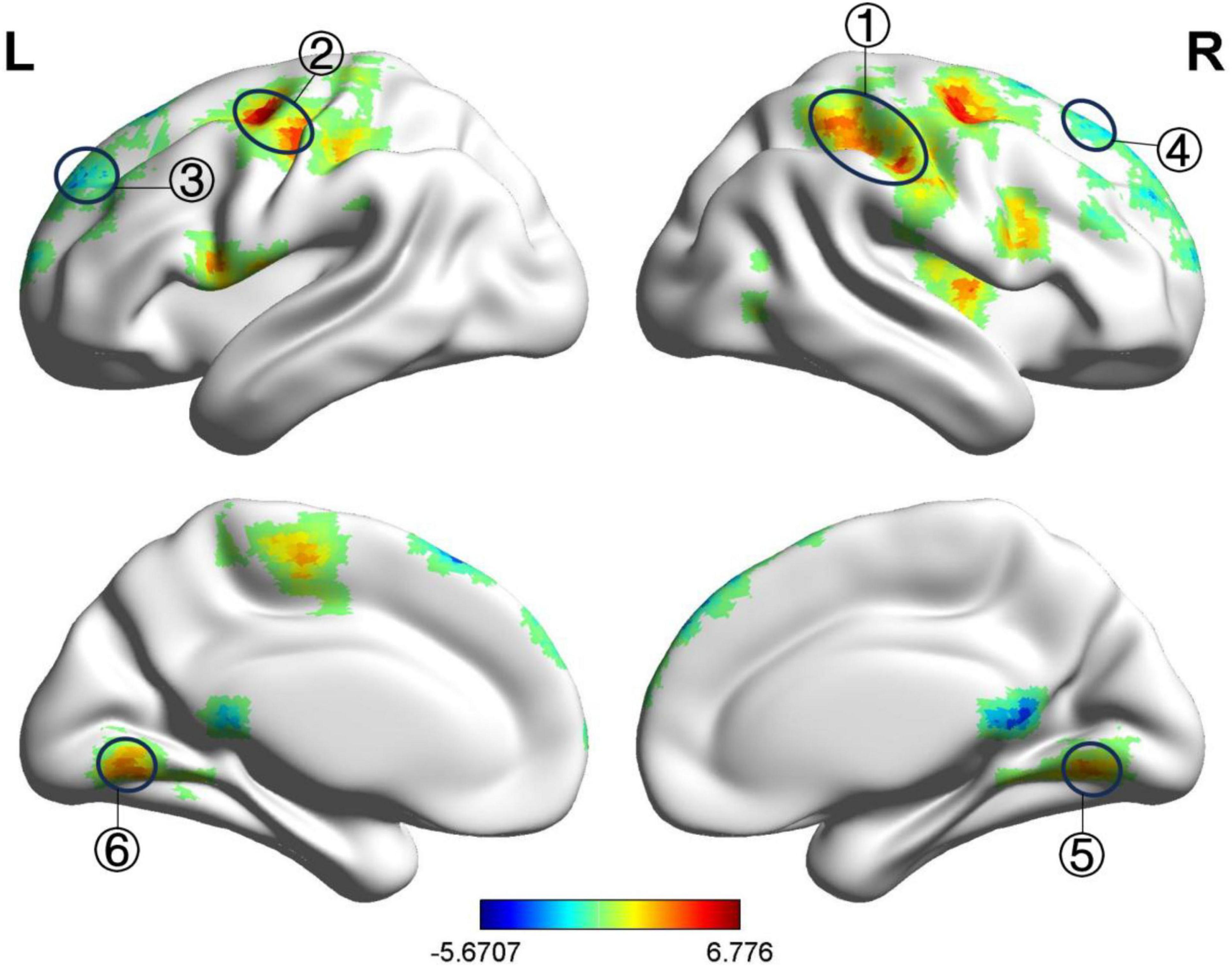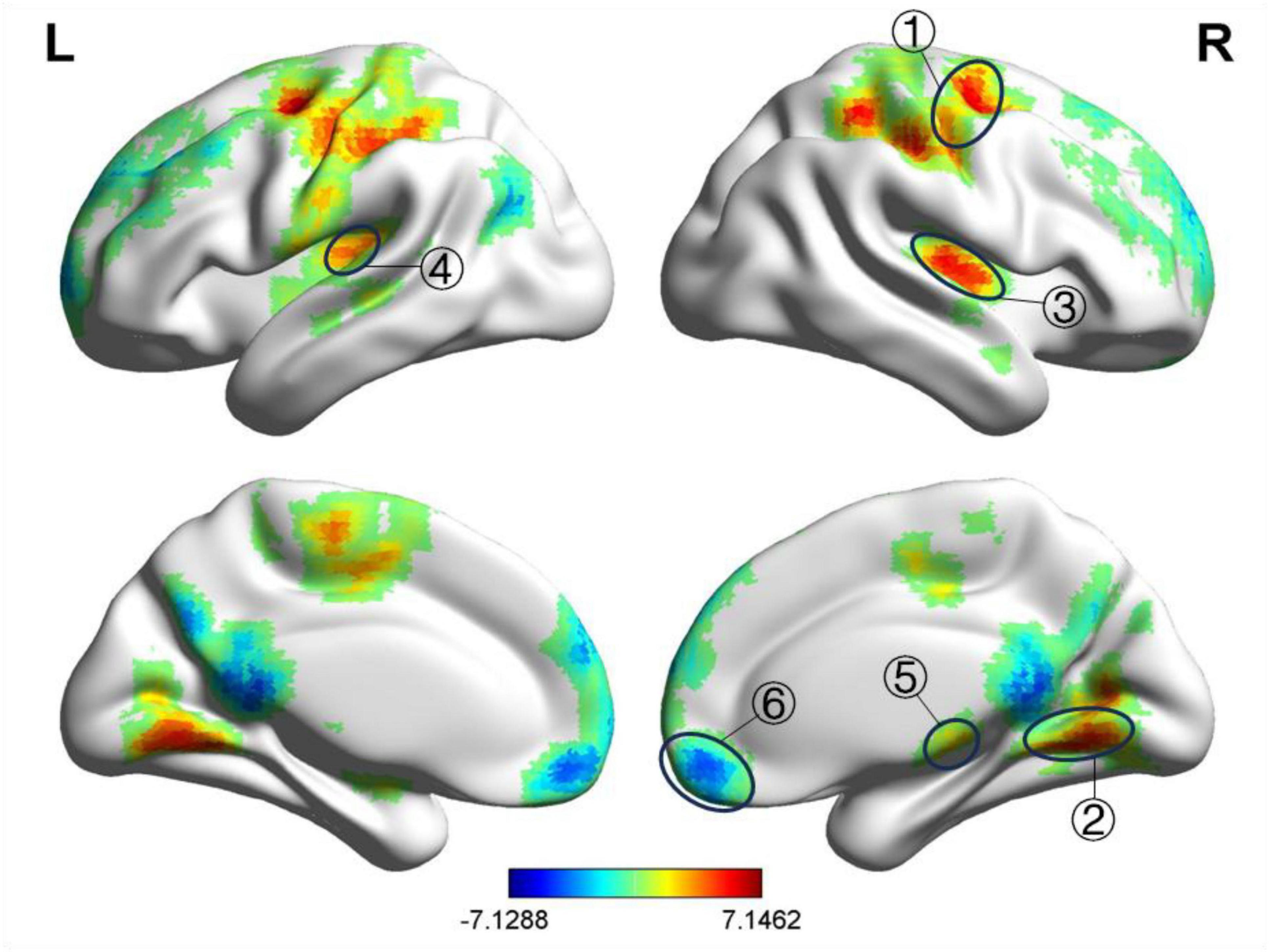 Figure 5. Significant differences in ReHo between after acupuncture treatment BP patients and HC. The result was corrected for GRF with voxel P < 0.001, cluster P < 0.05. ① Right precentral gyrus, ② Right lingual gyrus, ③ Right transverse temporal gyrus, ④ Left transverse temporal gyrus, ⑤ Right thalamus, ⑥ Right middle frontal gyrus.