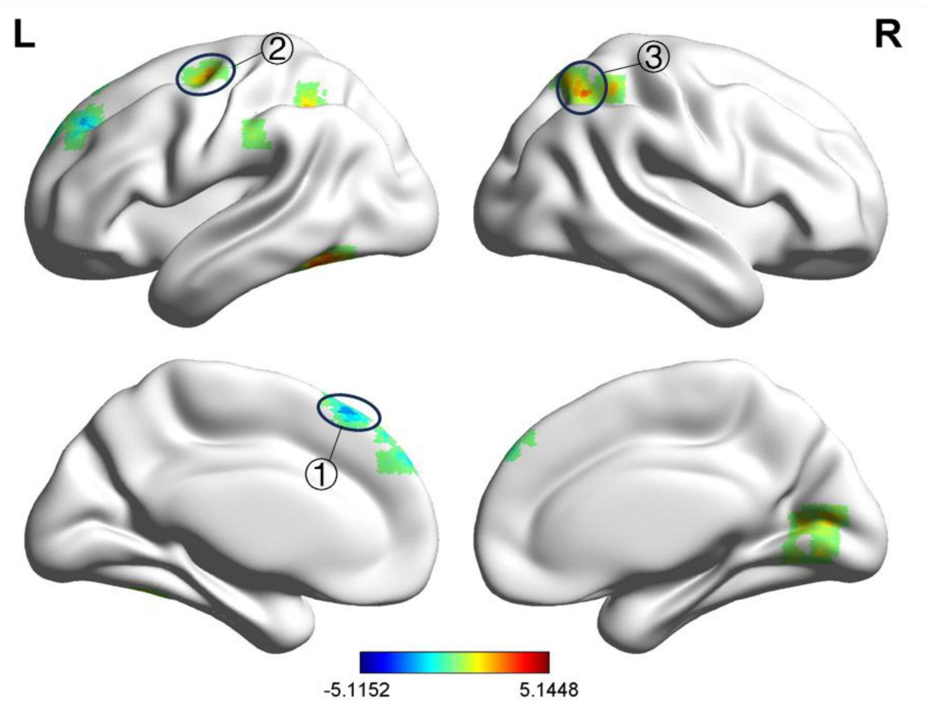 Figure 6. Significant differences in fALFF between after and before acupuncture treatment BP patients. The result was corrected for GRF with voxel P < 0.001, cluster P < 0.05. ① Left medial superior frontal gyrus, ② Left precentral gyrus, ③ Right angular gyrus.