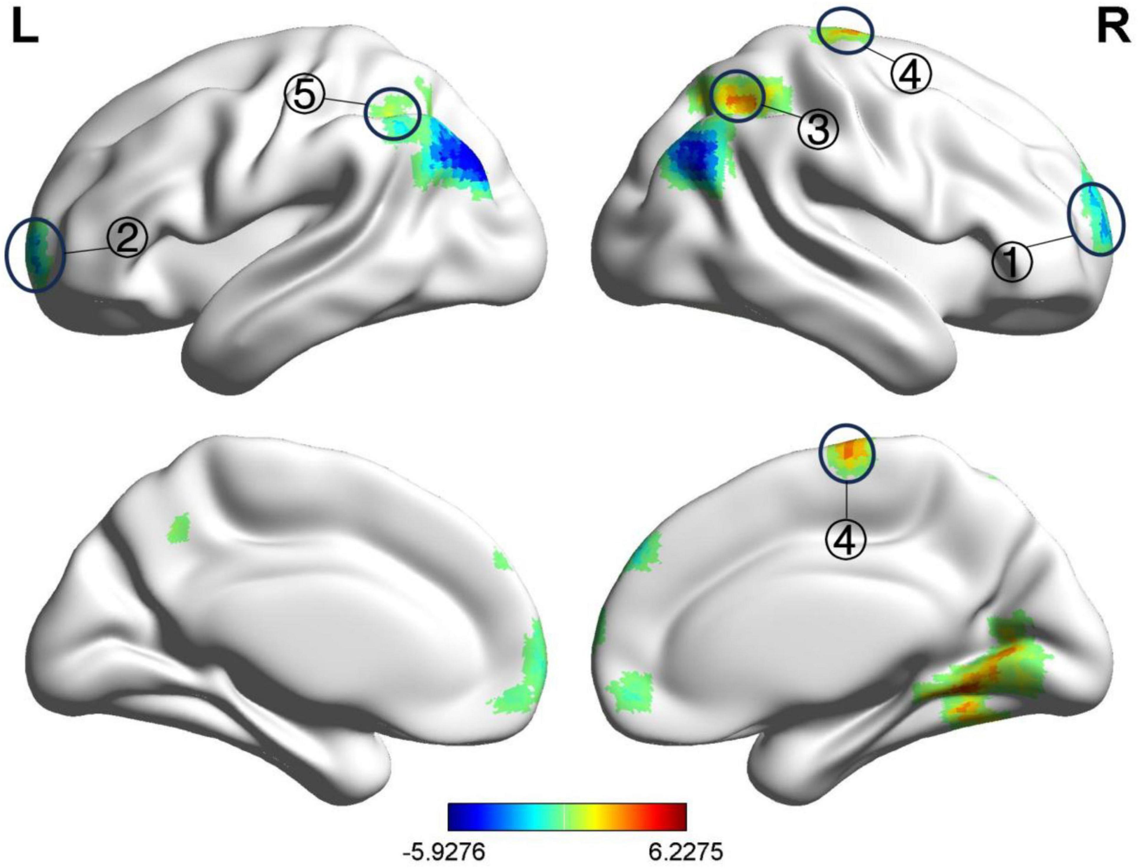 Figure 7. Significant differences in ReHo between after and before acupuncture treatment BP patients. The result was corrected for GRF with voxel P < 0.001, cluster P < 0.05. ① Right medial superior frontal gyrus, ② Left medial superior frontal gyrus, ③ Right inferior parietal lobule (angular gyrus), ④ Right precentral gyrus, ⑤ Left superior parietal gyrus.
