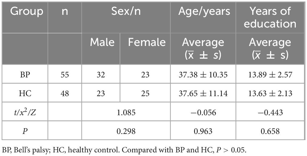Between September 2023 and September 2024, a total of 103 participants were recruited from the First Affiliated Hospital of Anhui University of Traditional Chinese Medicine, including 55 patients in the BP group and 48 in the HC group. None of the participants dropped out. All subjects completed the fMRI scans, and all 55 patients underwent acupuncture treatment without any serious adverse effects. There were no significant differences in age, sex, or years of education between the two groups. The demographic details of all participants are presented in Table 1.