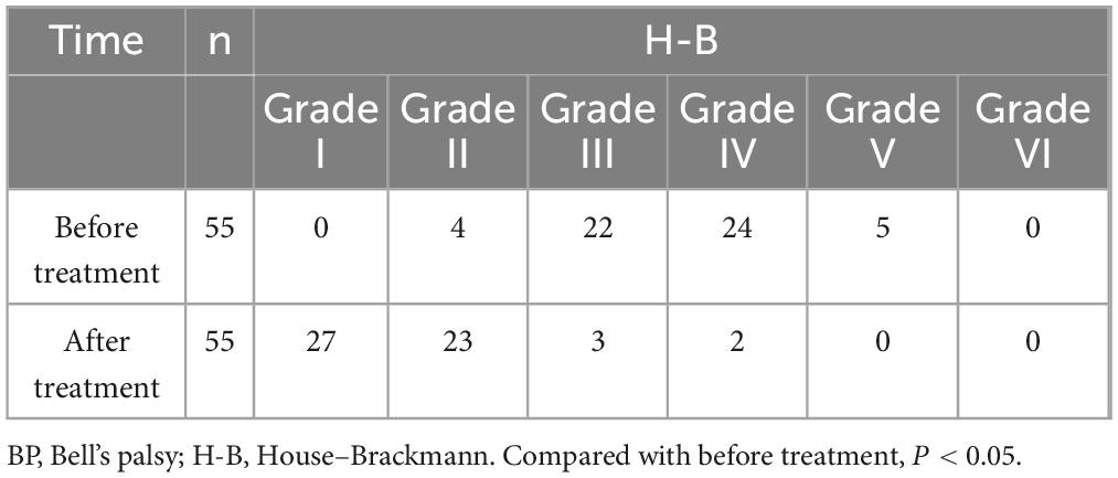 Based on the H-B scale (House and Brackmann, 1985), treatment outcomes were categorized as follows: Cured: H-B grade I; Markedly effective: H-B grade II; Effective: H-B grade III; Ineffective: H-B grades IV–VI.