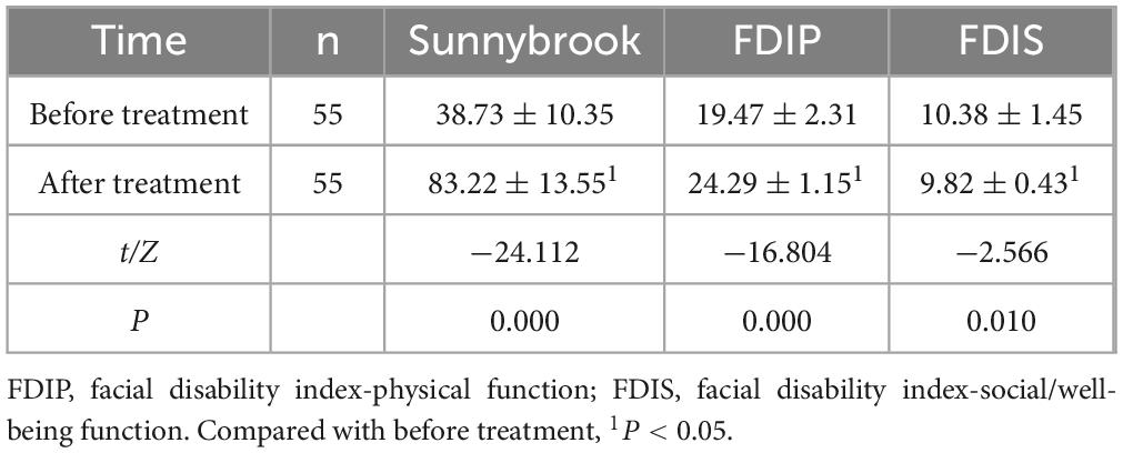 3.2 Comparison of H-B scale, Sunnybrook, and FDI (including FDIP and FDIS) scores before and after treatment in the BP group