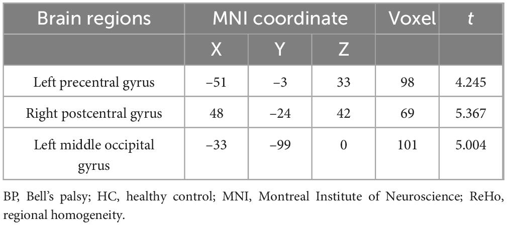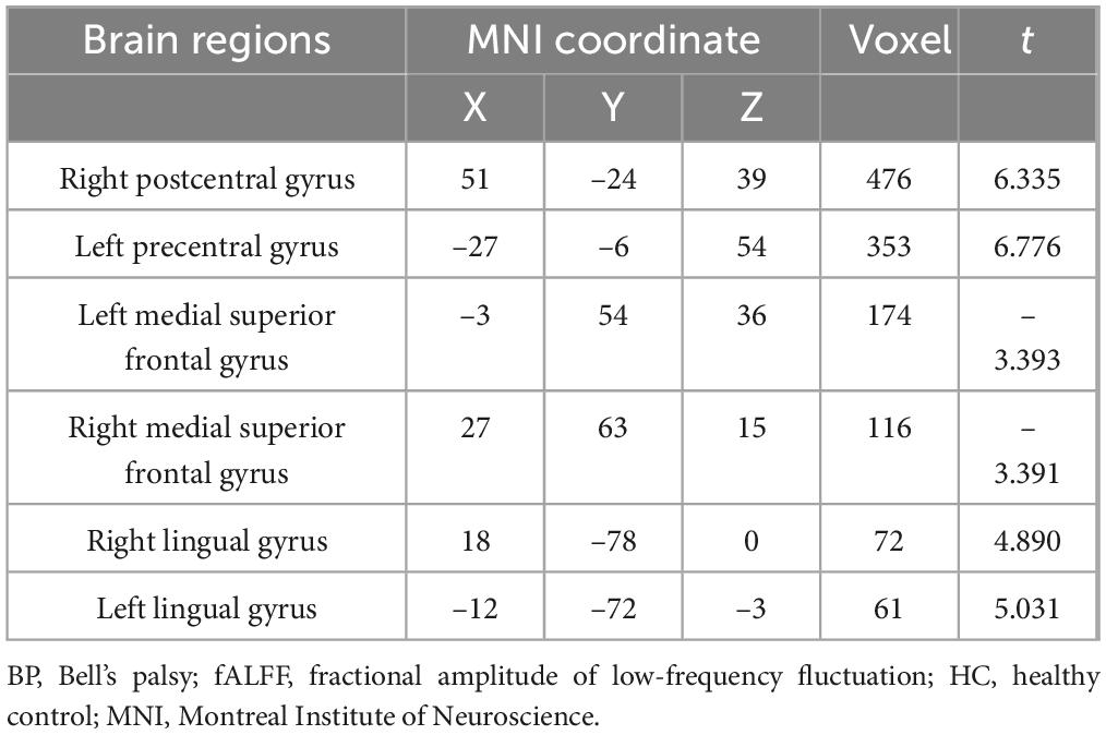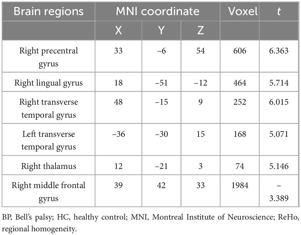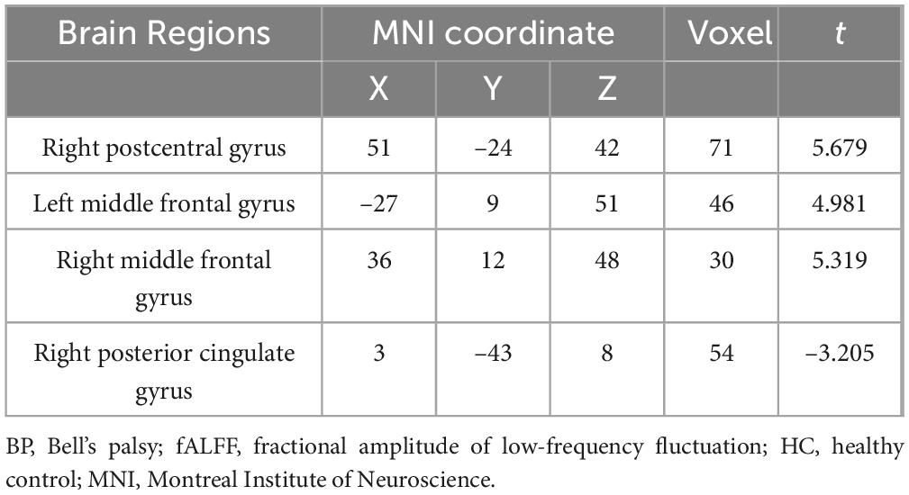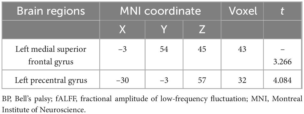 The results of this study showed that, compared with the HCs, BP patients had higher fALFF and ReHo values in the anterior central and lingual gyri, higher fALFF values in the central posterior gyrus, lower fALFF values in the superior frontal gyrus, higher ReHo values in the temporal transverse gyrus and thalamus, and lower ReHo values in the right middle frontal gyrus after acupuncture treatment. These changes suggest that acupuncture may be involved in modulating neuronal activity in these brain regions, thereby alleviating symptoms of facial paralysis and facial sensory and motor dysfunction in BP patients. Studies have shown (Yang et al., 2012) that acupuncture treatment in patients with BP results in enhanced connectivity between the primary sensory cortex, primary motor cortex, superior frontal gyrus, and premotor area of the middle frontal gyrus in their brain regions. The possible mechanism is that due to the loss of facial muscle function, BP patients are unable to fully execute the neural instructions sent by the primary sensory cortex and primary motor cortex. Consequently, higher-level central premotor areas are required to play a role in motor coordination, thereby strengthening the linkage between the primary sensory cortex and the primary motor cortex. This study found that acupuncture enhances the activity of the precentral gyrus, postcentral gyrus, lingual gyrus, transverse temporal gyrus, and thalamus. These brain regions are mainly responsible for regulating somatic motor function, sensory function, visual information processing, emotional regulation, and other aspects. Using resting-state fMRI, Kong et al. (2015) observed that acupuncture at Hegu (LI4) and Jiache (ST6) acupoints in BP patients could activate brain regions such as the precentral gyrus, postcentral gyrus, and middle frontal gyrus, which correspond to the somatosensory cortex, motor cortex, and prefrontal cortex. Additionally, a study by Liu et al. (2014) also showed that acupuncture treatment in BP patients results in functional reorganization in the premotor cortex and supplementary motor area of the cerebral cortex. These findings are largely consistent with the results of this study. Taken together, we speculate that acupuncture can regulate brain functional plasticity and enhance the functional connectivity between relevant brain regions by activating areas such as the somatosensory cortex, motor cortex, and prefrontal cortex of the brain. As a key region for functions like emotional regulation (Wang et al., 2017), the superior frontal gyrus exhibits reduced activity, suggesting that acupuncture alleviates negative emotions, such as anxiety and inferiority, by improving the facial appearance of patients, thereby restoring emotion-related cortical regions from a state of overactivation to a stable level, consistent with the decreased FDIS scores in patients. The decreased ReHo values in the middle frontal gyrus indicate a reduction in the compensatory overactivation of the middle frontal gyrus in BP patients and a return of brain function to a normal level; therefore, this finding should be considered a potential imaging manifestation of therapeutic efficacy. The present study reveals that BP patients still experience functional abnormalities in multiple brain regions after acupuncture treatment, suggesting that even after clinical recovery, BP patients still exhibit partial brain functional reorganization. A study by Klingner et al. (2011) corroborates this finding.