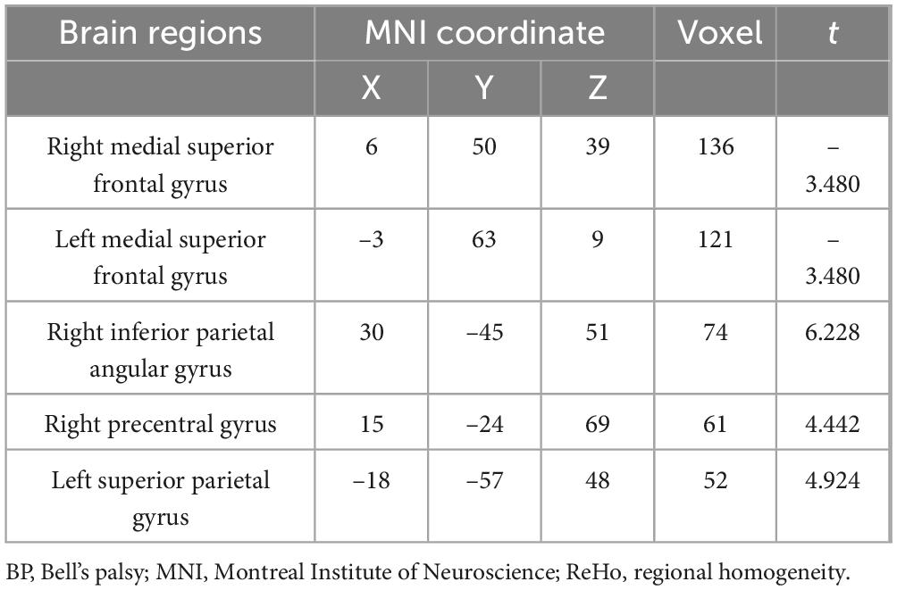 In the present study, the fALFF values in the right angular gyrus, the ReHo values in the right inferior parietal lobule (angular gyrus) and the left superior parietal gyrus, and the fALFF and ReHo values in the precentral gyrus increased whereas the fALFF and ReHo values in the superior frontal gyrus decreased after acupuncture treatment compared with the pretreatment values in BP patients. The parietal lobe (Yang and Gang, 2015; Zhang et al., 2019)—including the postcentral, superior parietal, and angular gyri and the inferior parietal lobule—is a critical brain region that participates in motor planning and coordination by interacting with the motor cortex; this is crucial in relearning fine motor control of the face in BP patients. Facial paralysis can impair patients’ facial perception, and the parietal lobe can aid in adjusting and adapting to these changes. The increases in the values of indicators related to the parietal lobe observed after treatment suggest that acupuncture enhances the neural activity capacity and synchrony in this region, which may strengthen functional coordination within and across distinct brain regions. The superior frontal gyrus (Wang et al., 2017) is involved in emotional regulation. The decreased fALFF and ReHo values observed in this region after acupuncture treatment may be associated with the improvement of emotional function observed following acupuncture treatment in BP patients Reduced brain regional activity may reflect a stabilization of patients’ emotional state following acupuncture treatment. The precentral gyrus (Song et al., 2024) is responsible for motor control and sensory information integration, particularly the fine movements of the face and other body parts. The increased fALFF and ReHo values detected in this gyrus after treatment indicate that acupuncture enhances the neural activity and functional coordination in this region. In BP patients, the enhanced function of the precentral gyrus may promote the repair of damaged nerves or improve the efficiency of neural signal transmission, thereby facilitating the recovery of facial motor function. The increased ReHo and fALFF values may also reflect the reorganization or optimization of brain functional networks after acupuncture treatment. Such changes may contribute to improved regulation of facial motor control by the brain, demonstrating the plasticity and self-repair capacity of the brain.